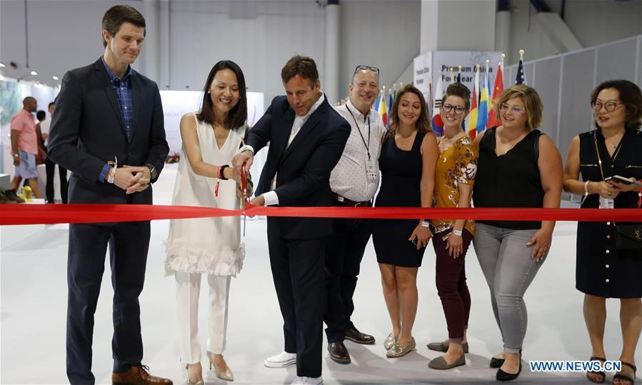 Guests cut a ribbon at the opening ceremony of the China Footwear Pavilion at the Las Vegas MAGIC Show in Las Vegas, the United States, on Aug. 12, 2019. As one of the largest and most influential fashion trade shows in America, the MAGIC Show is not only a fashion trade affair but a display of manufacturing resources from around the world. (Xinhua/Li Ying)