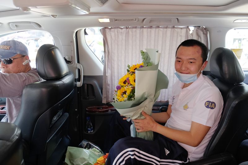 Fu Guohao (R), a journalist from Global Times, a Beijing-based newspaper, leaves Princess Margaret Hospital in south China's Hong Kong, Aug. 14, 2019. (Xinhua/Wang Shen)