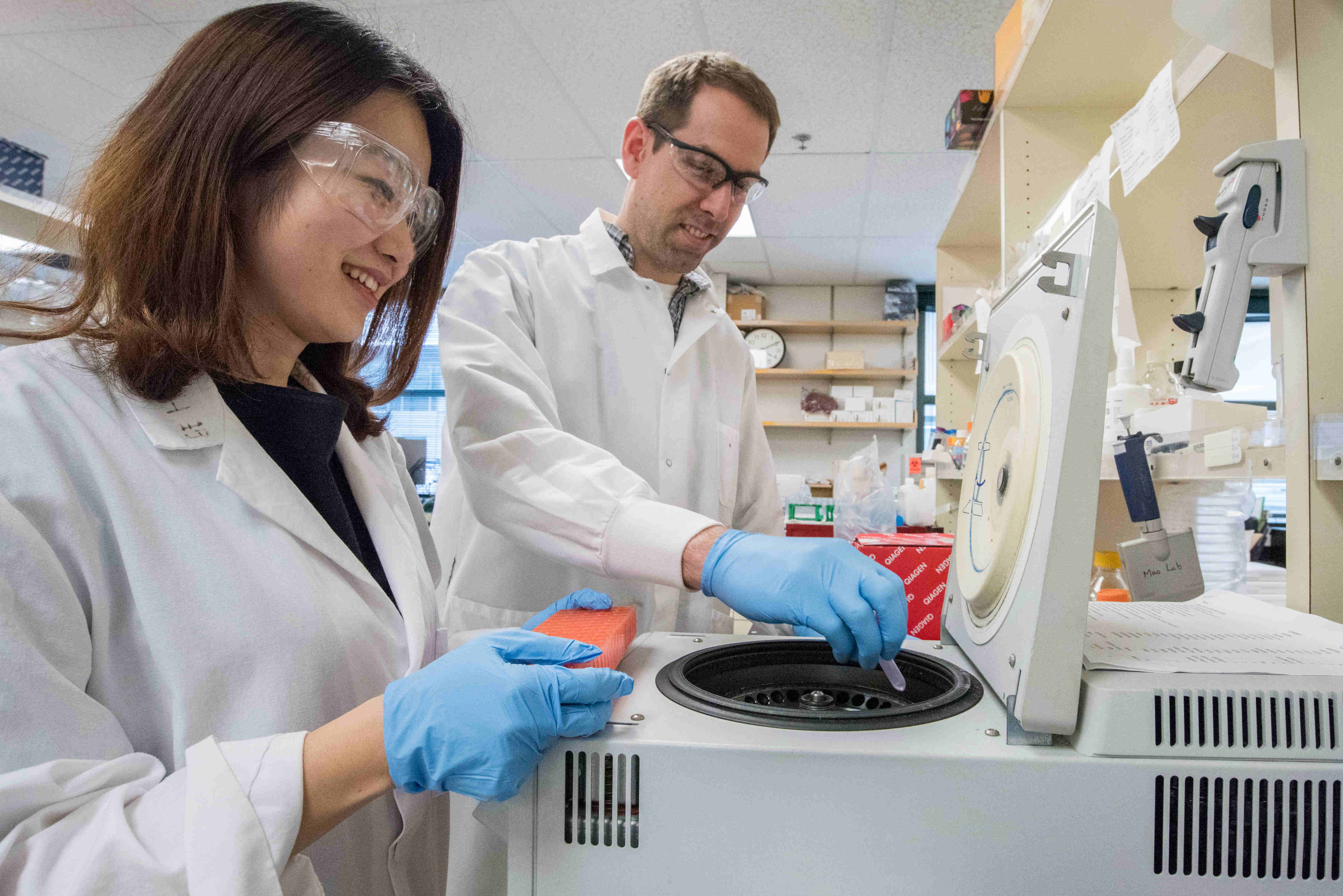 Lawrence Berkeley National Laboratory scientist Antoine Snijders (R) experiment with China's Nanjing Drum Tower Hospital researcher Wang Pin in San Francisco, the United States, on Jan. 11, 2017. (Xinhua/Berkeley Lab)