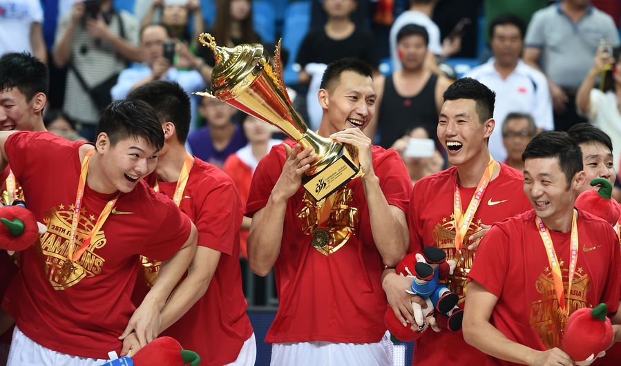 Yi Jianlian of China (C) lifts the trophy after China beat the Phillipines 78-67 to win the Asian Championship in Changsha, central China's Hunan province, on October 3, 2015. (Xinhua/Li Ga)