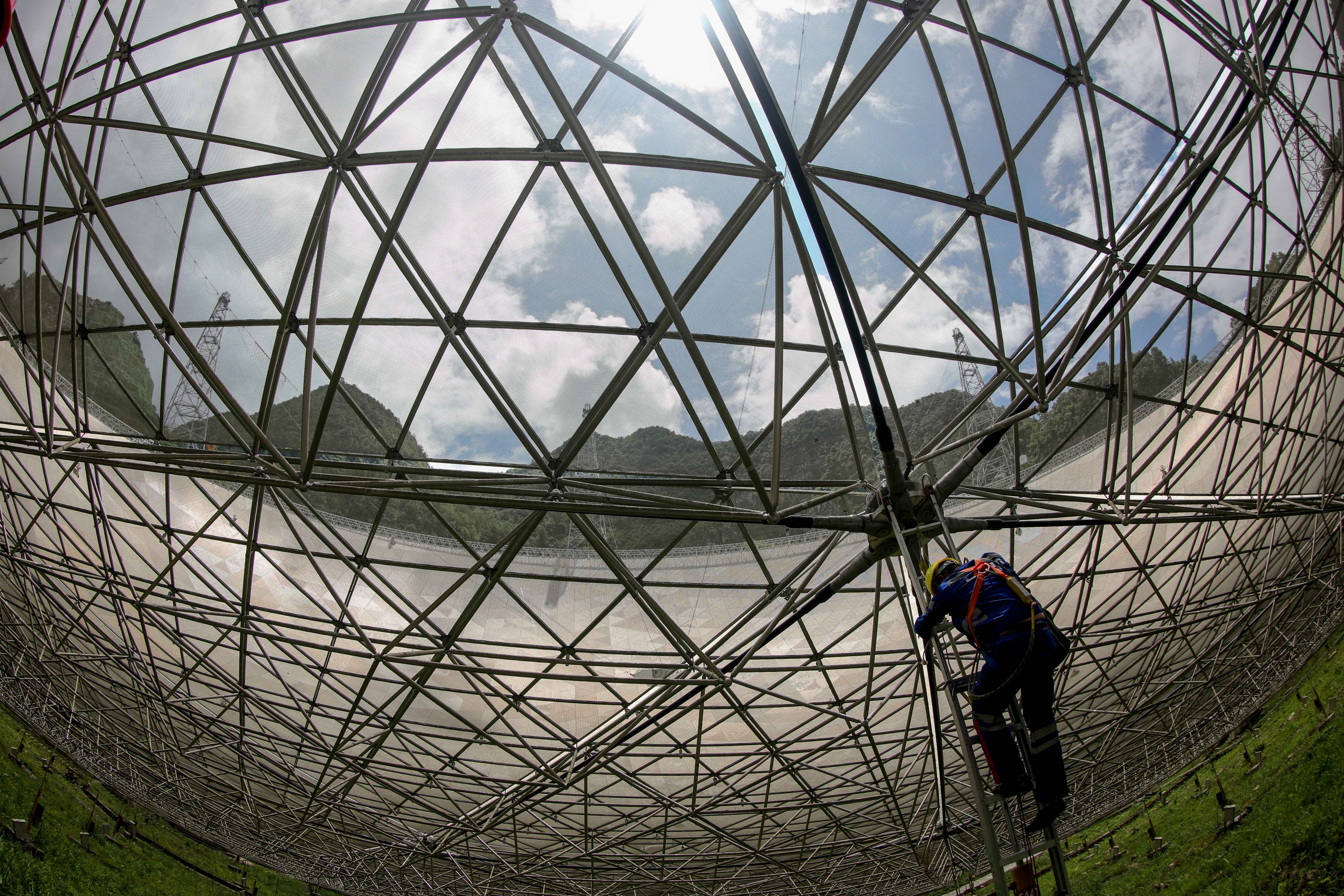Staff members conduct maintenance operation for China's Five-hundred-meter Aperture Spherical radio Telescope (FAST) in southwest China's Guizhou Province, Aug. 28, 2019.(Xinhua/Ou Dongqu)