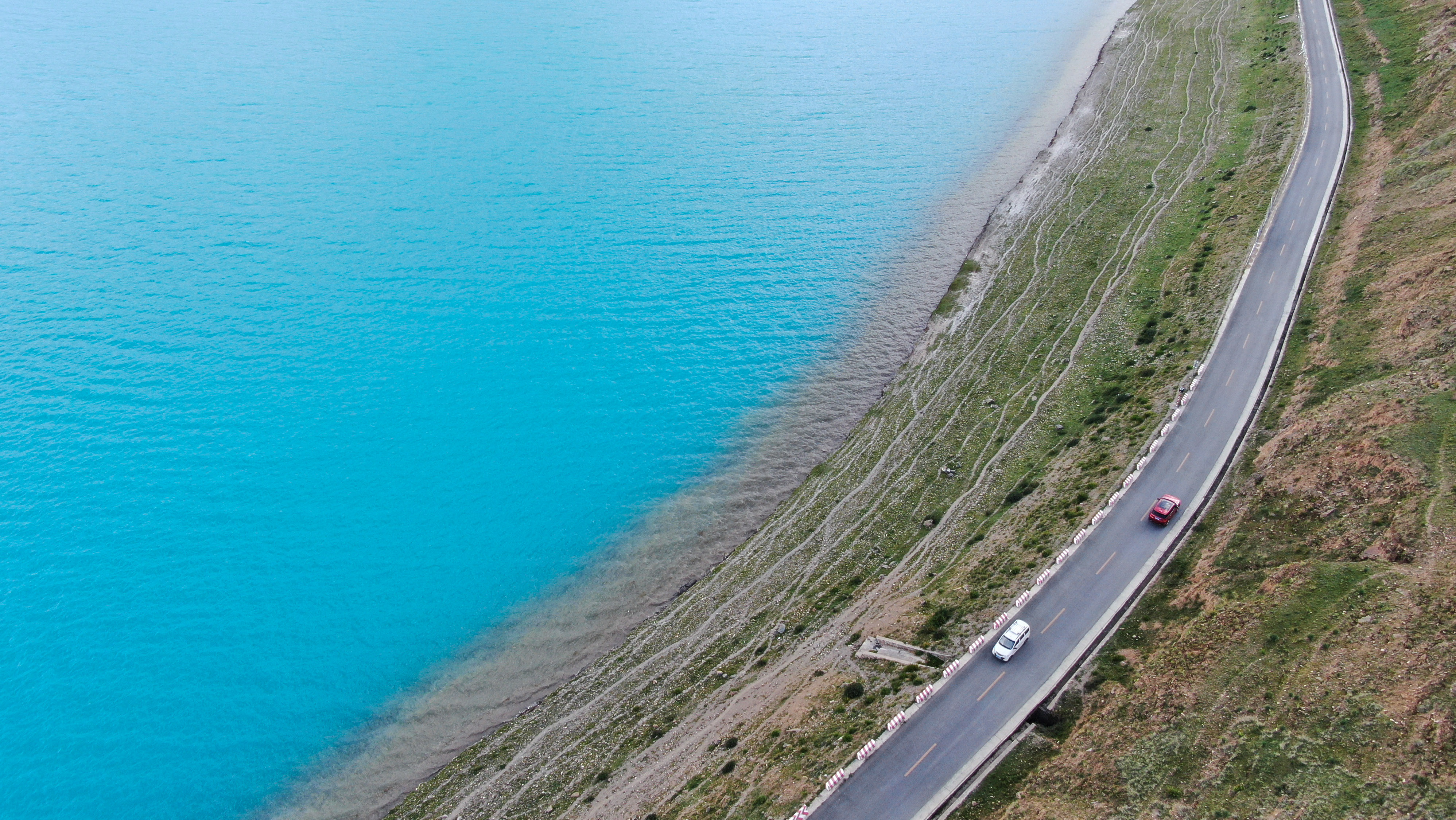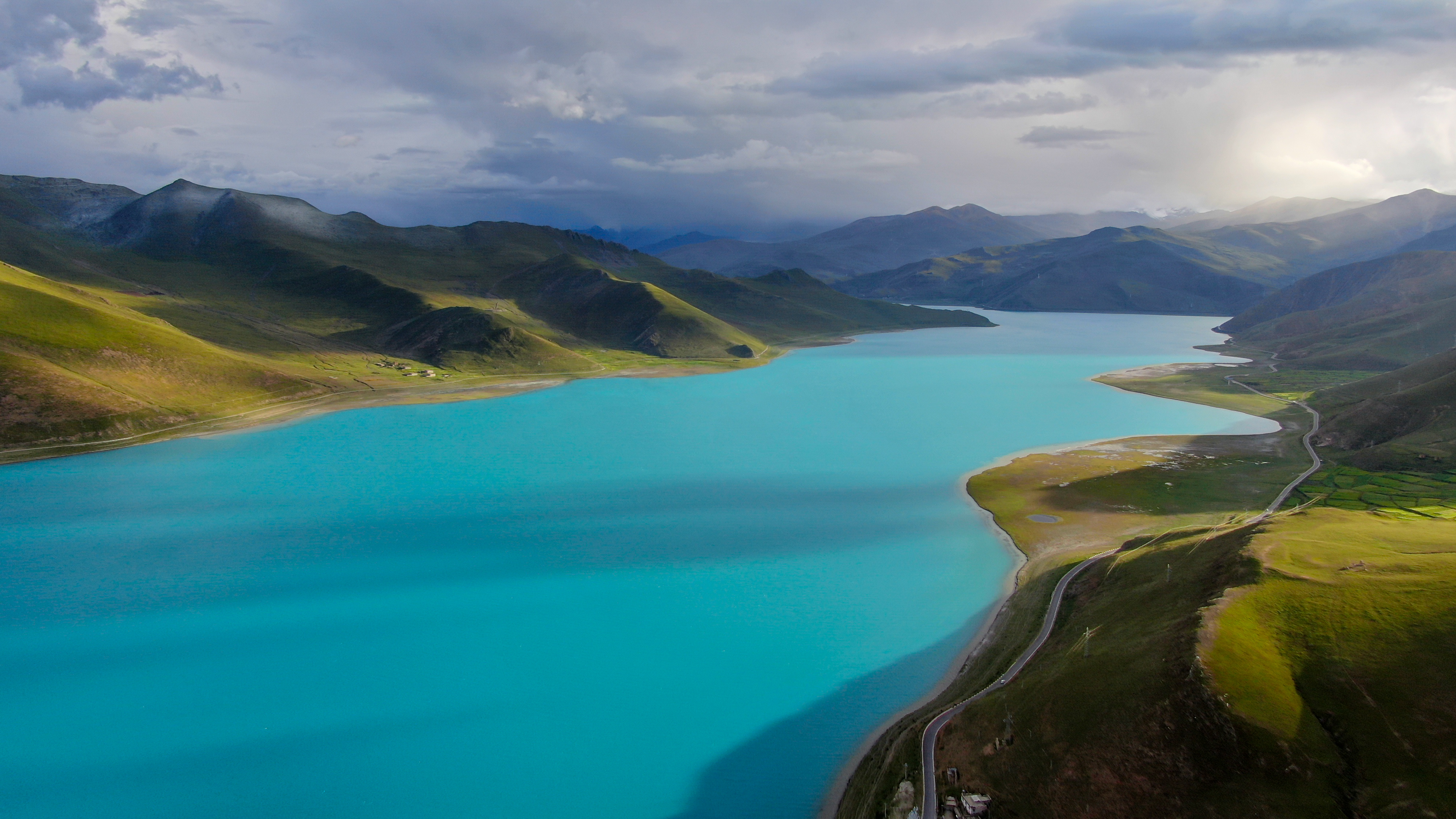 Placid and peaceful: enjoy the aerial view of Tibet's holy lake, Yamdrok Lake.