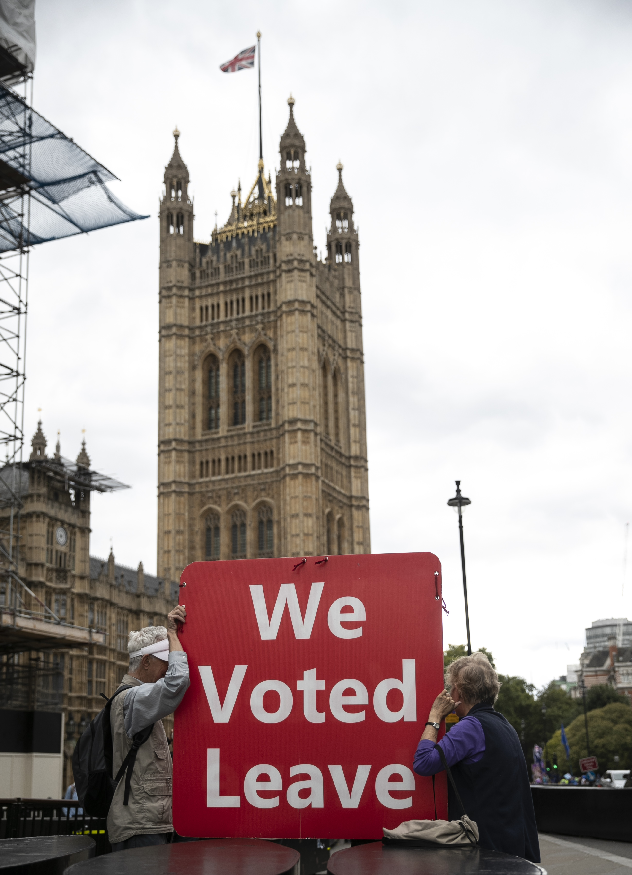 Demonstrators gather outside the Houses of Parliament in London, Britain on Sept. 3, 2019.(Xinhua/Han Yan)