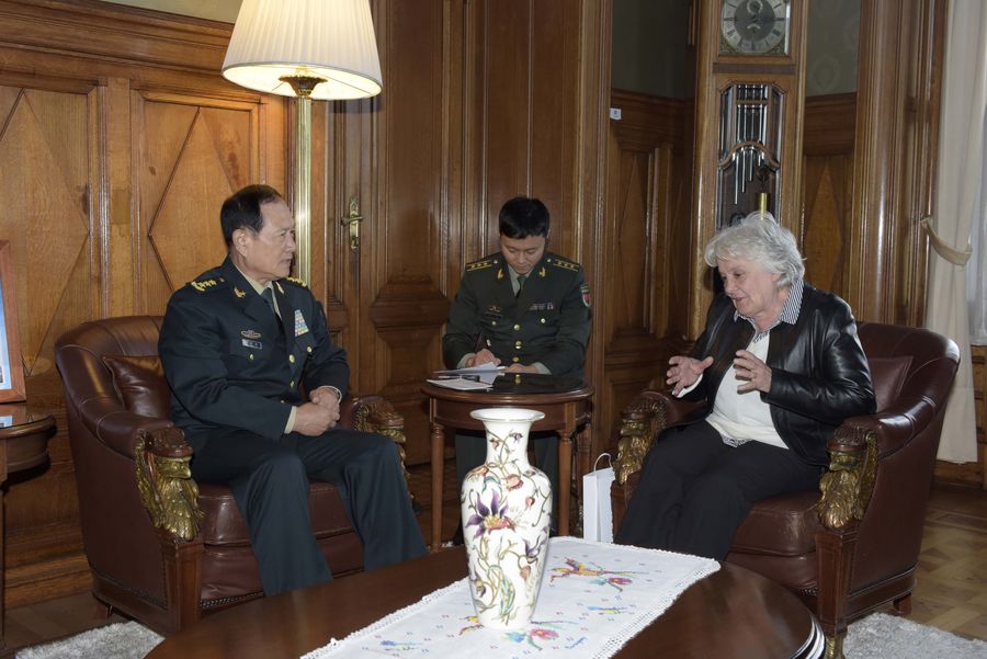 Uruguayan Vice President Lucia Topolansky (R) meets with visiting Chinese State Councilor and Minister of National Defense Wei Fenghe in Montevideo, Uruguay, Sept. 2, 2019. (Photo by Fan Xianhai/Xinhua)