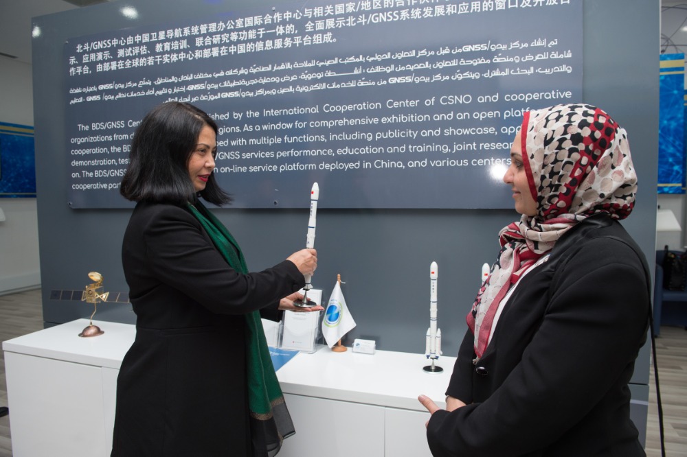 Nada Nour Laabidi (L), a narrator at the China-Arab States BDS/GNSS Center, introduces China's carrier rocket sending satellites of BeiDou Navigation Satellite System (BDS), in Tunis, capital of Tunisia, April 1, 2019. (Xinhua/Meng Tao)