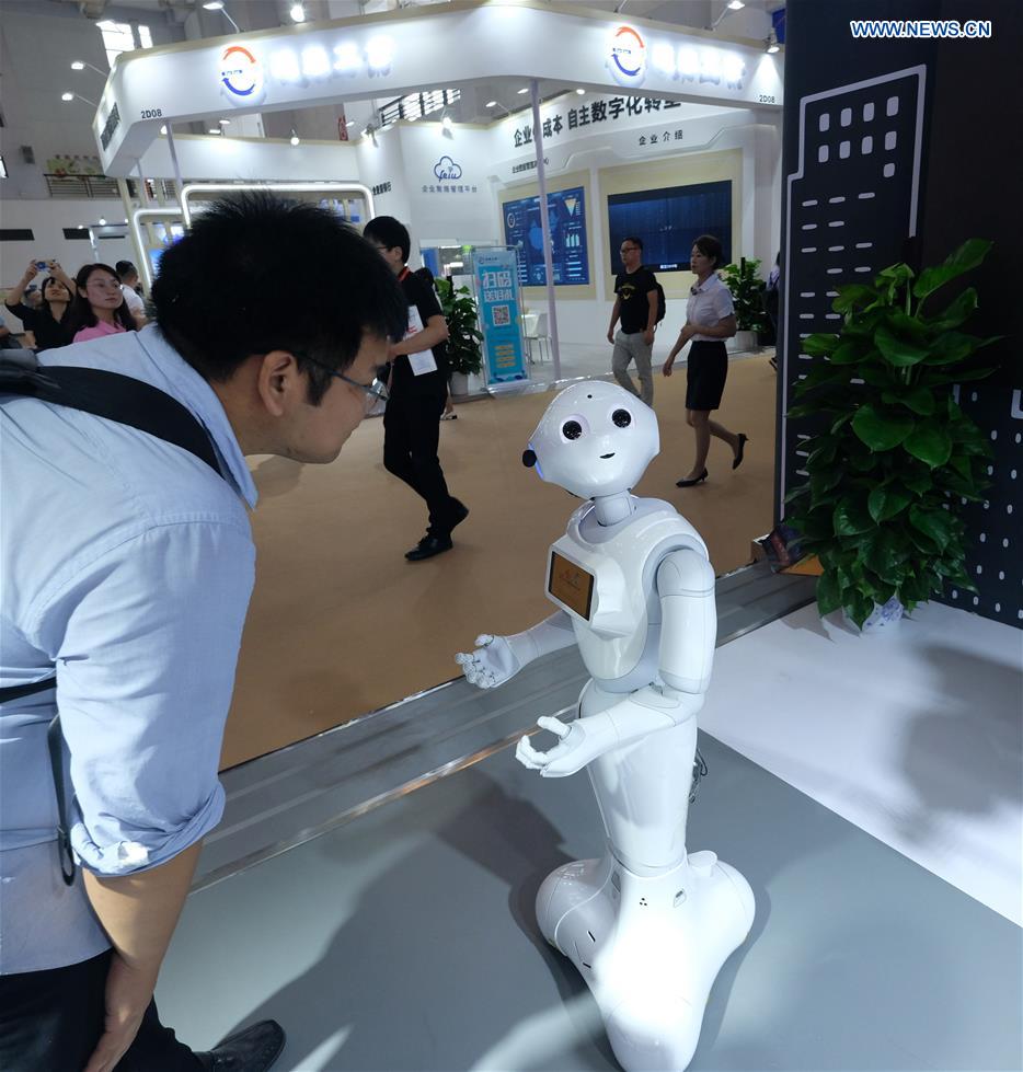 A visitor speaks to a robot at the 9th China Smart City and Intelligent Economy Expo in Ningbo, east China's Zhejiang Province, Sept. 6, 2019. Unveiled here on Friday, the 9th China Smart City and Intelligent Economy Expo showcases latest products and technologies in the area. (Xinhua/Xu Yu)