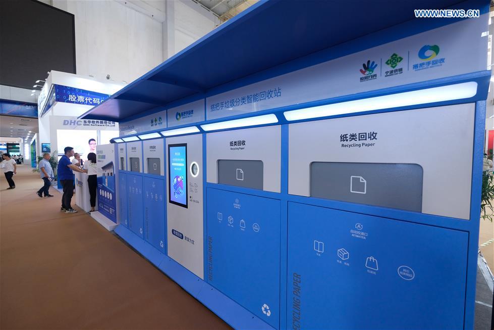 Photo taken on Sept. 6, 2019 shows an intelligent garbage sorting and recycling station on display at the 9th China Smart City and Intelligent Economy Expo in Ningbo, east China's Zhejiang Province. Unveiled here on Friday, the 9th China Smart City and Intelligent Economy Expo showcases latest products and technologies in the area. (Xinhua/Xu Yu)