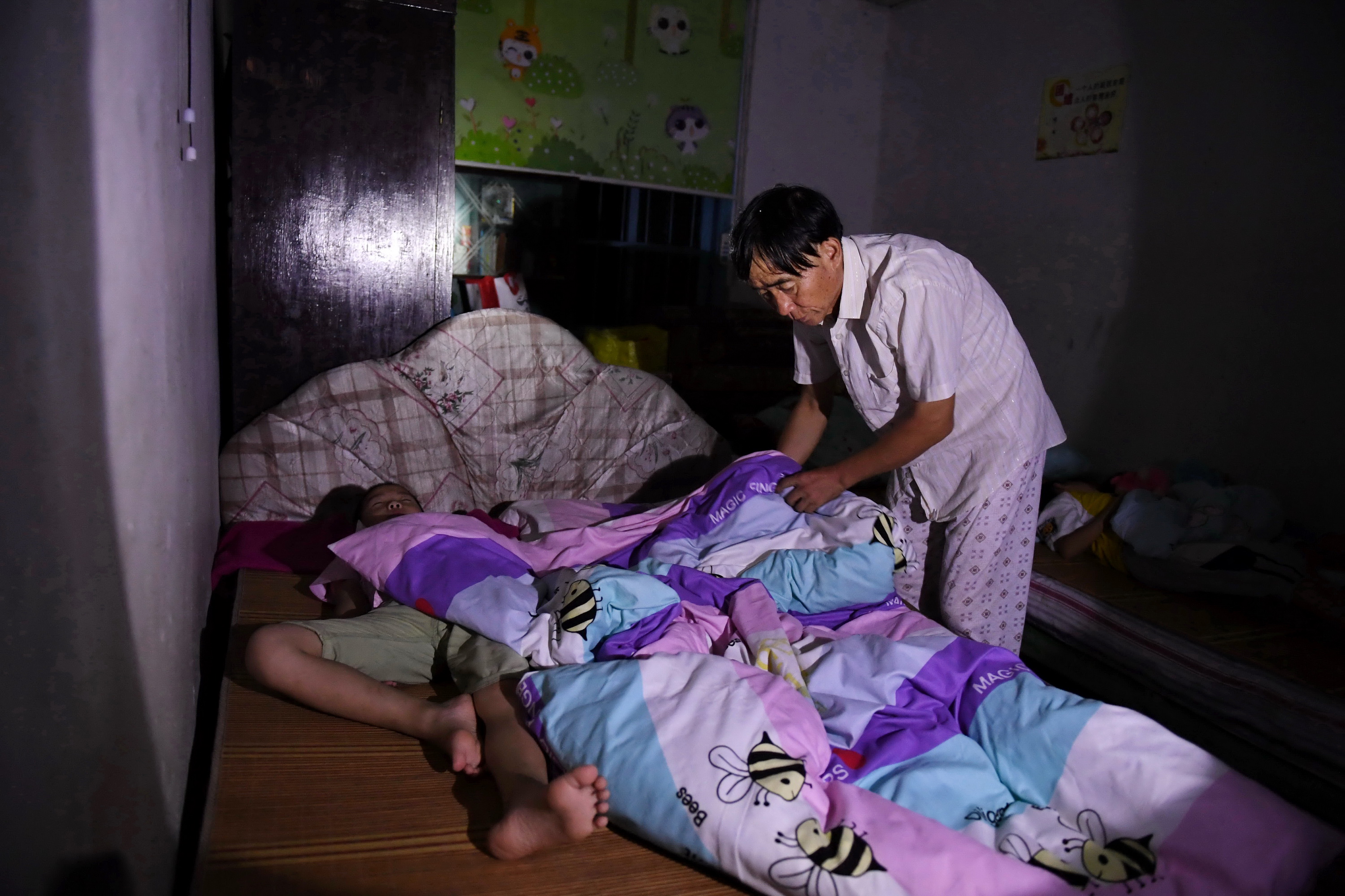 Zhuang Guigan covers the quilt for students at the Xijin She ethnic group primary school, Sept. 3, 2019. (Xinhua/Lin Shanchuan)