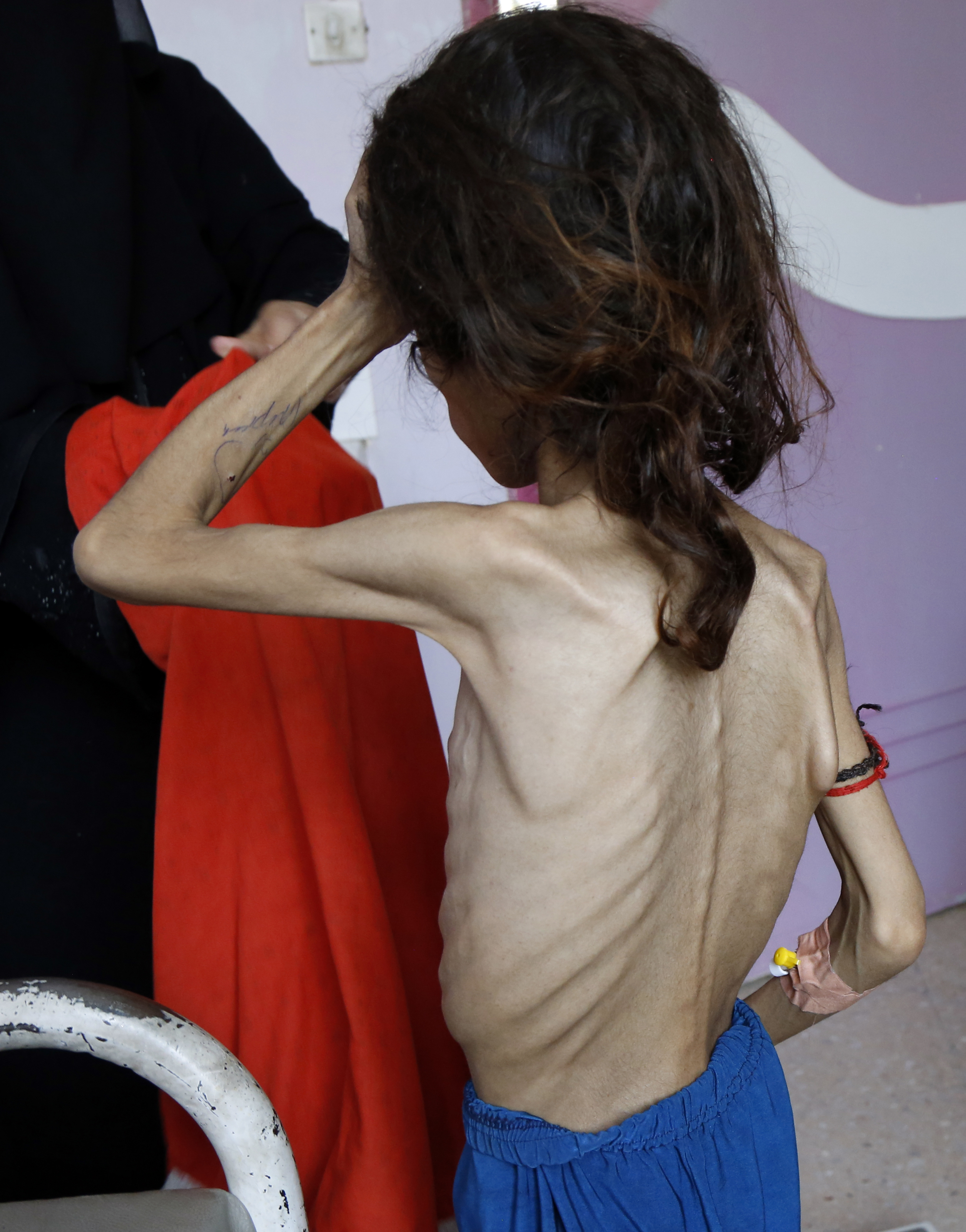 Sadia Ibrahim receives medical treatment at an anti-malnutrition treating center in Al-Sabeen hospital in Sanaa, Yemen, on Sept. 12, 2019. Sadia Ibrahim facepalmed herself feeling dizzy after the doctor diagnosed her as "skin and bones." The 11-year-old severely malnourished girl now weighs around 12 kg. She lies on a bed in Al-Sabeen hospital in Yemen's capital Sanaa to receive treatment as doctors and her poor parents are trying to rescue her life. (Photo by Mohammed Mohammed/Xinhua)
