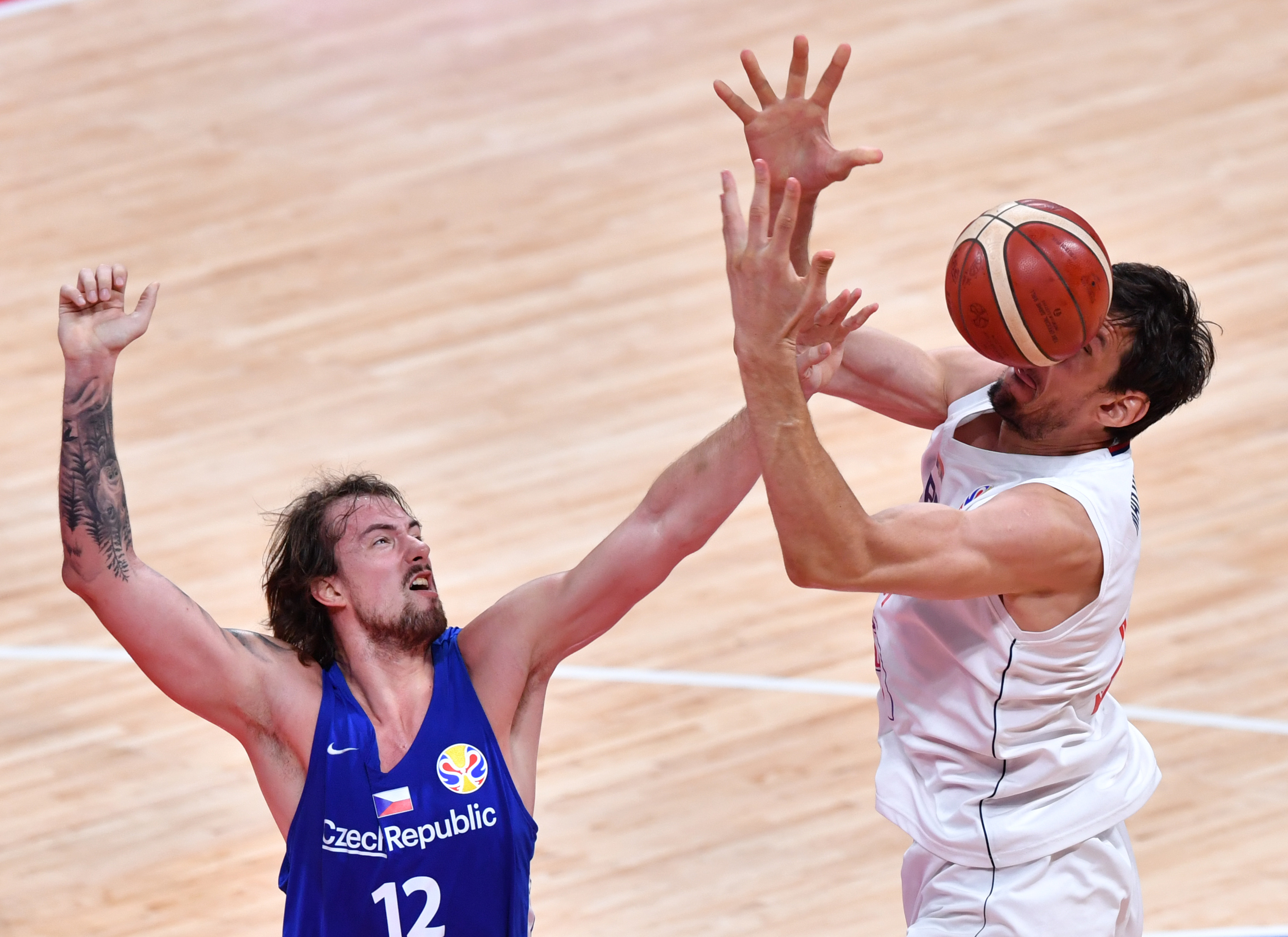 Ondrej Balvin (L) of the Czech Republic vies with Boban Marjanovic of Serbia during the Classification Games 5-6 between the Czech Republic and Serbia at the 2019 FIBA World Cup in Beijing, capital of China, Sept. 14, 2019. (Xinhua/He Changshan)