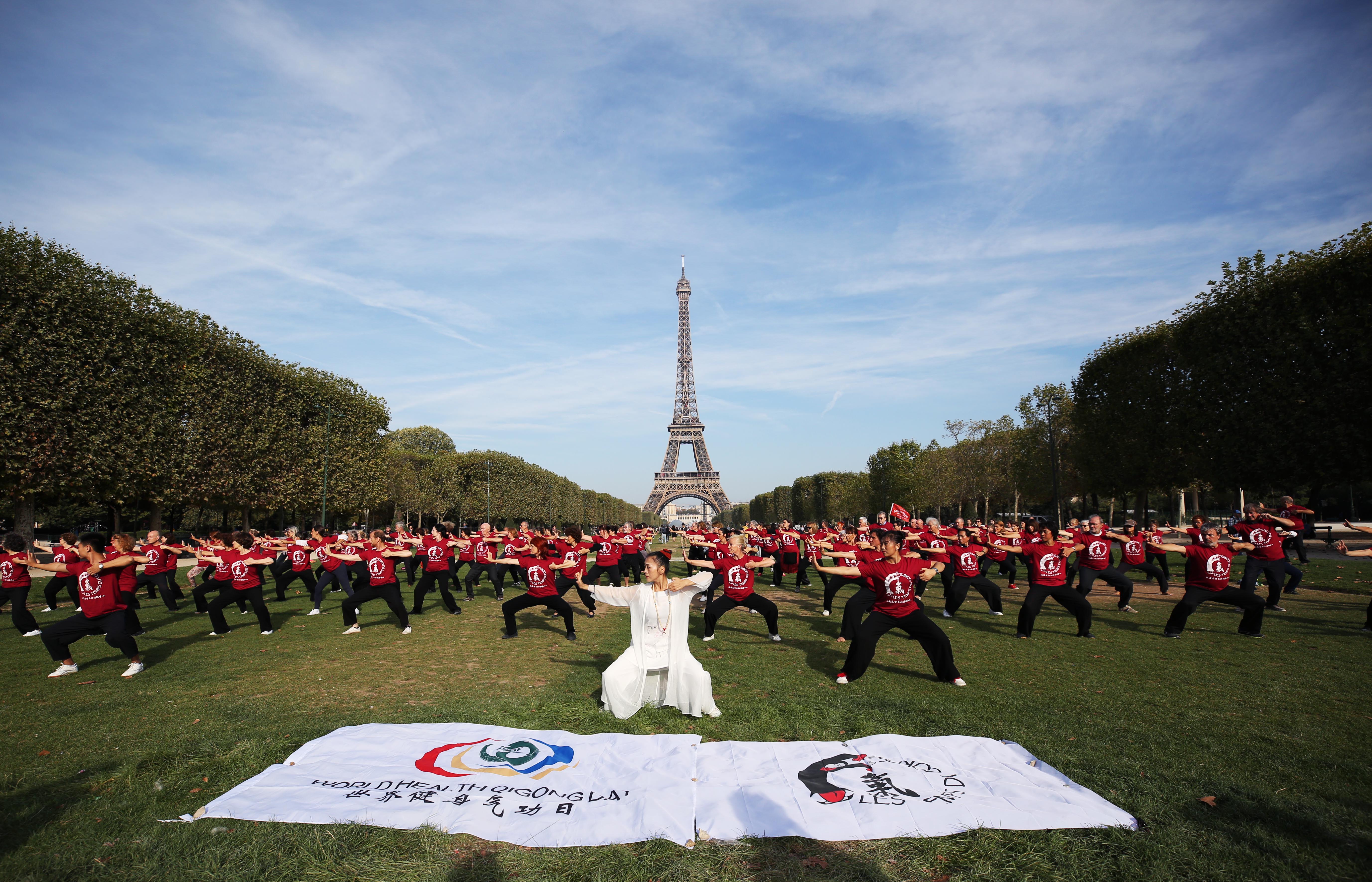 People practice Qigong, a traditional Chinese practice to cultivate and balance the body's inner energy, at Champs de Mars in Paris, France, Sept. 14, 2019. (Xinhua/Gao Jing)
