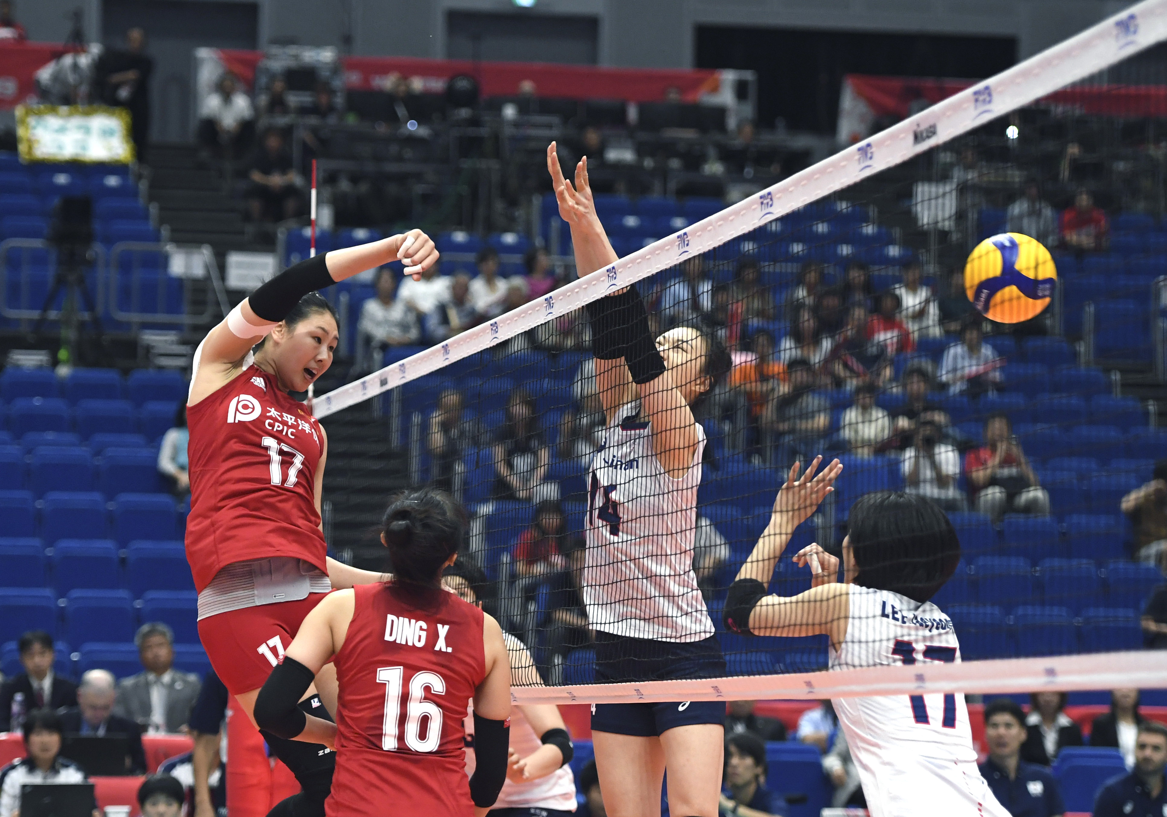 Yan Ni (top L) of China spikes during the Round Robin match between China and South Korea at the 2019 FIVB Women's World Cup in Yokohama, Japan, Sept. 14, 2019. (Xinhua/He Canling)