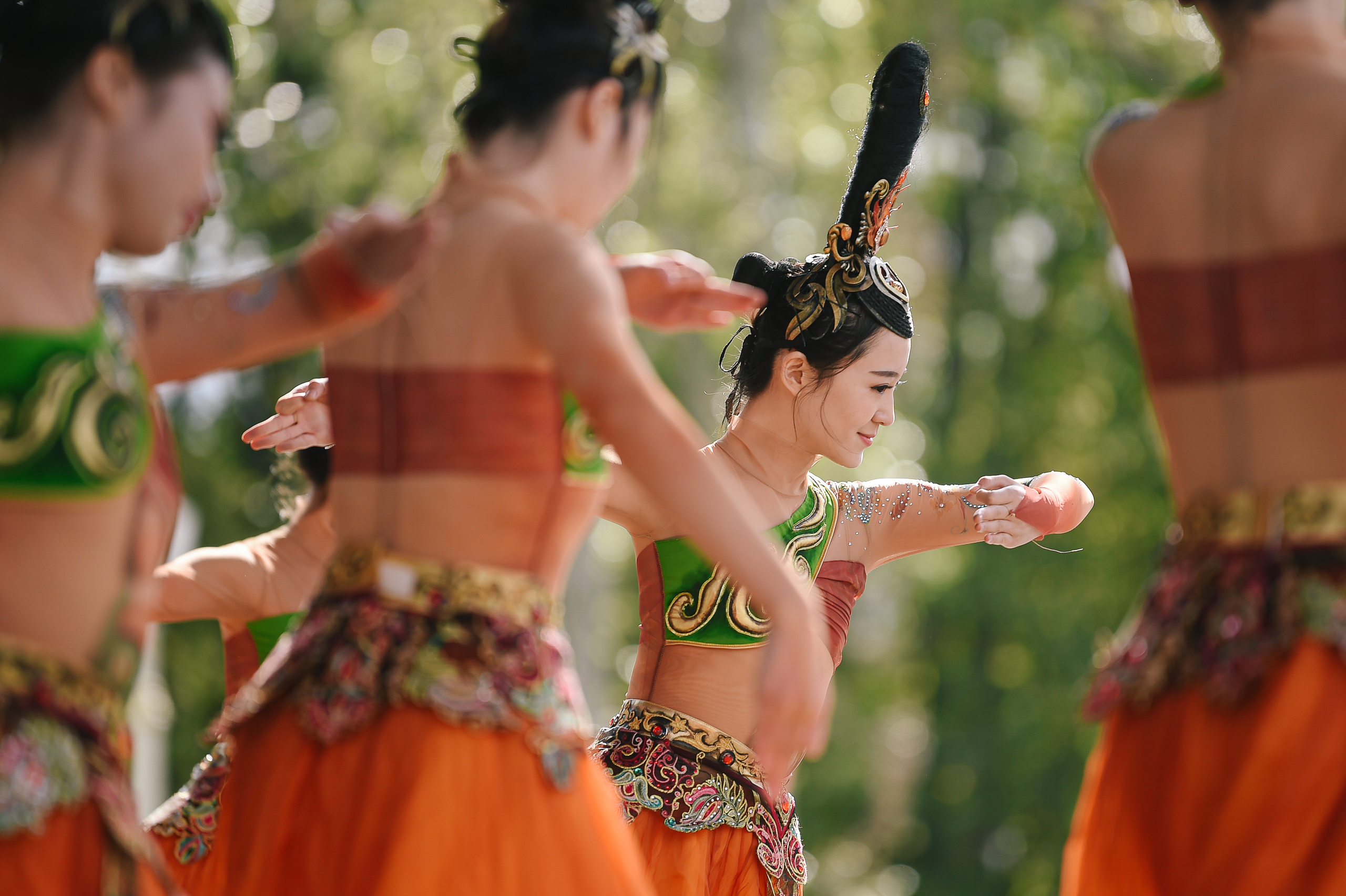 Artists dance during the China Festival in VDNKh park in Moscow, Russia, on Sept. 14, 2019. (Photo by Evgeny Sinitsyn/Xinhua)