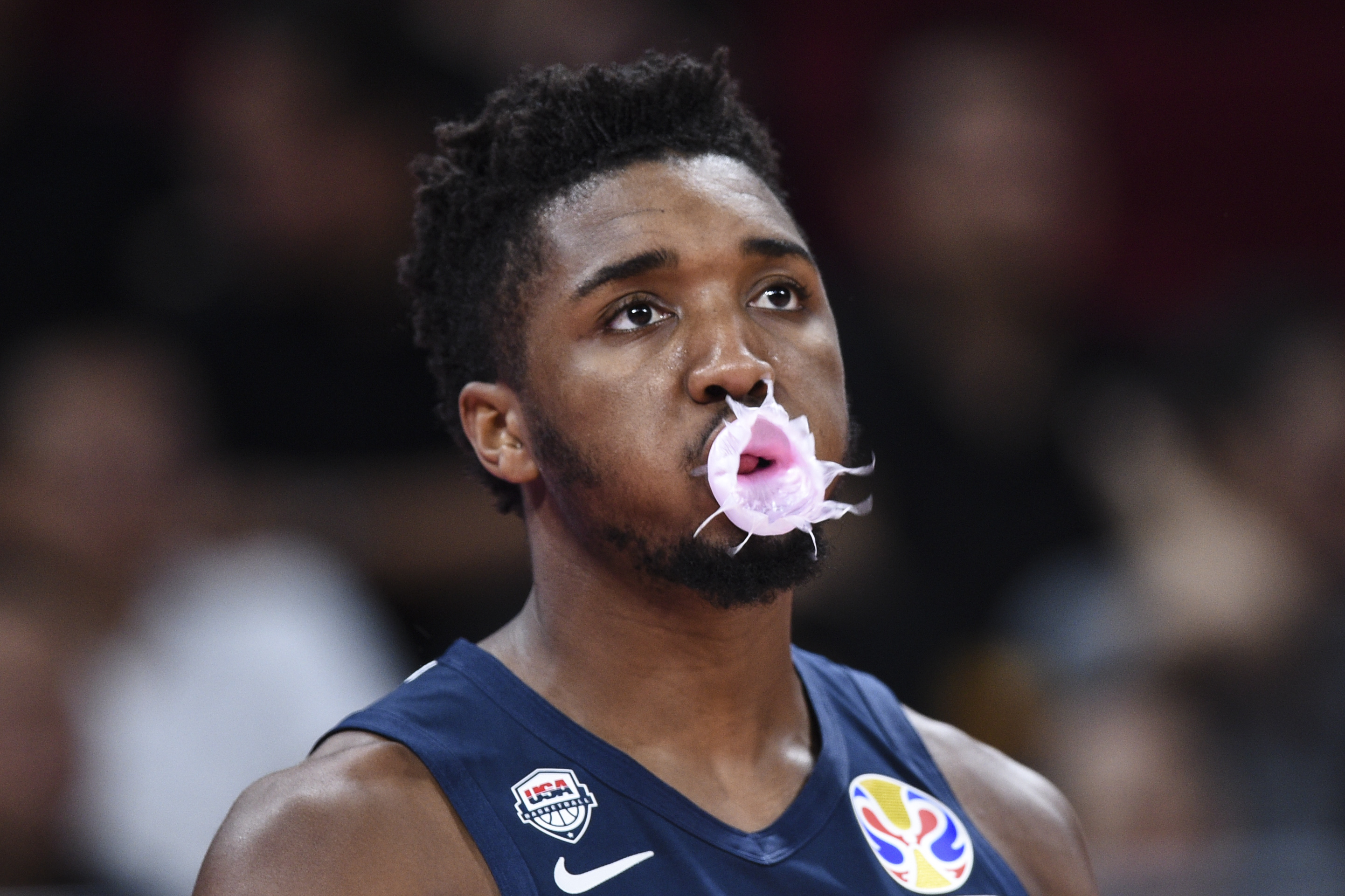 Donovan Mitchell of the United States blows a bubble before the Classification Games 7-8 between the United States and Poland at the 2019 FIBA World Cup in Beijing, capital of China, on Sept. 14, 2019. (Xinhua/Ju Huanzong)