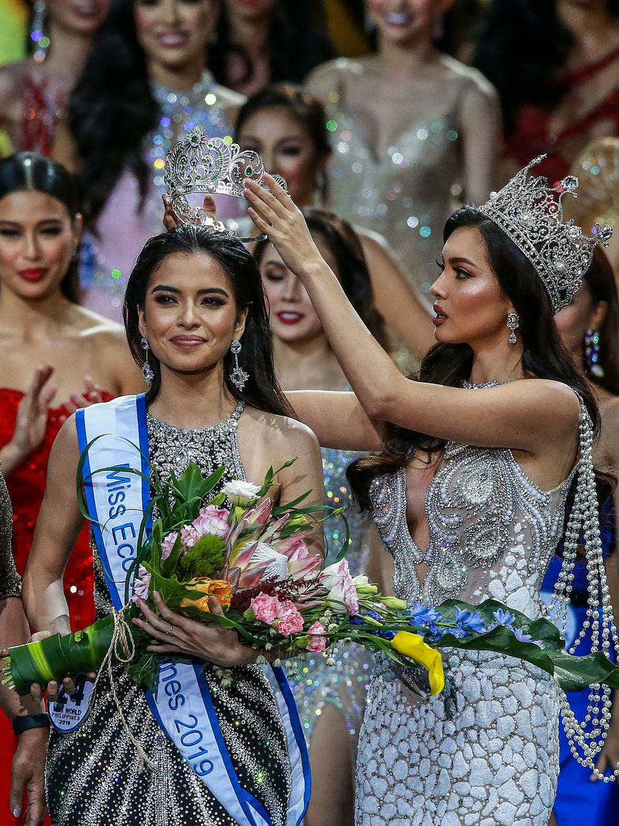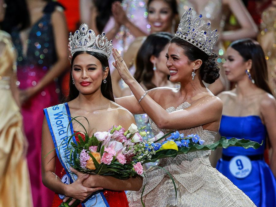 Michelle Dee (L) is crowned as Miss World Philippines 2019 during the coronation night of Miss World Philippines 2019 in Quezon City, the Philippines, Sept. 16, 2019. (Xinhua/Rouelle Umali)