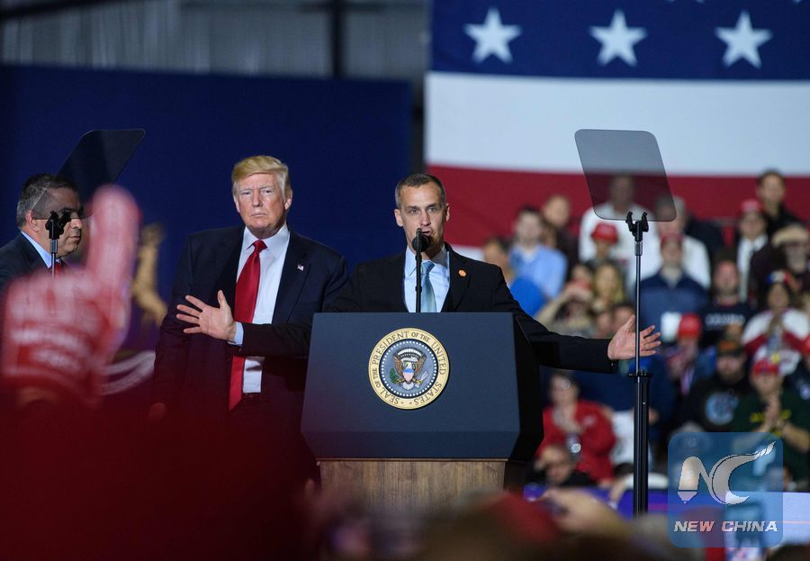Former Trump Campaign manager Corey Lewandowski speaks as US President Donald Trump looks on during a rally at Total Sports Park in Washington, Michigan on April 28, 2018. (Xinhua/AFP PHOTO)