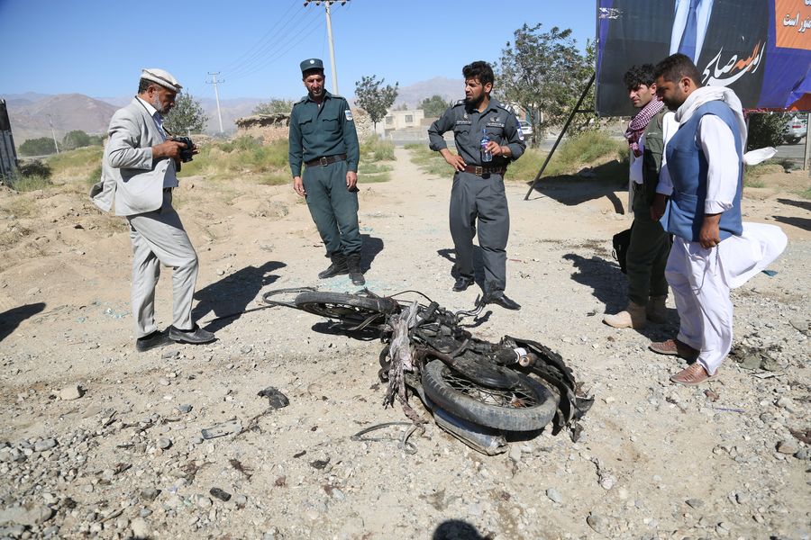 An Afghan policeman inspects the site of an attack in Charikar, capital of Parwan province, Afghanistan, Sept. 17, 2019. (Photo by Rohullah/Xinhua)