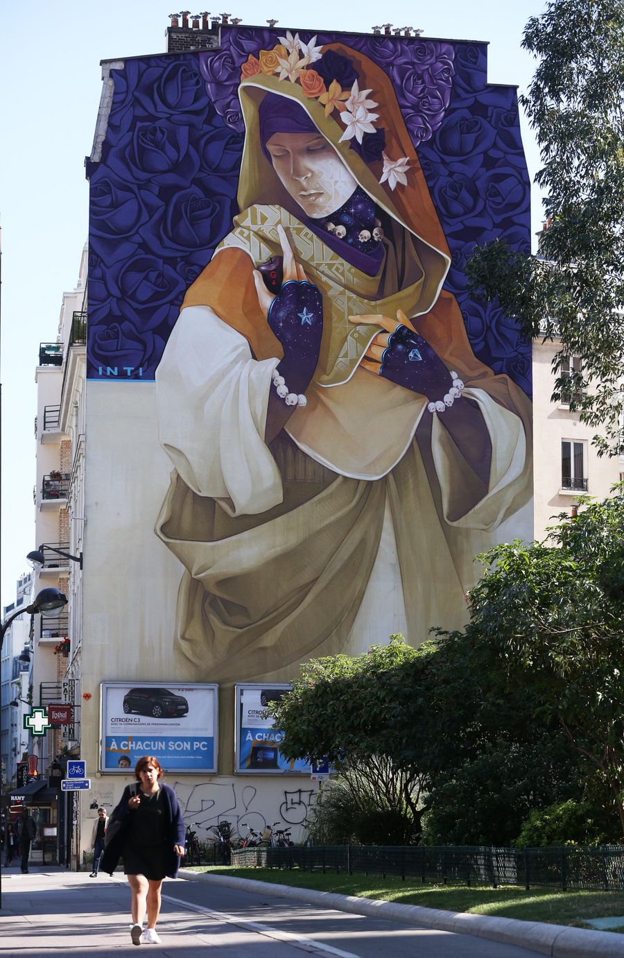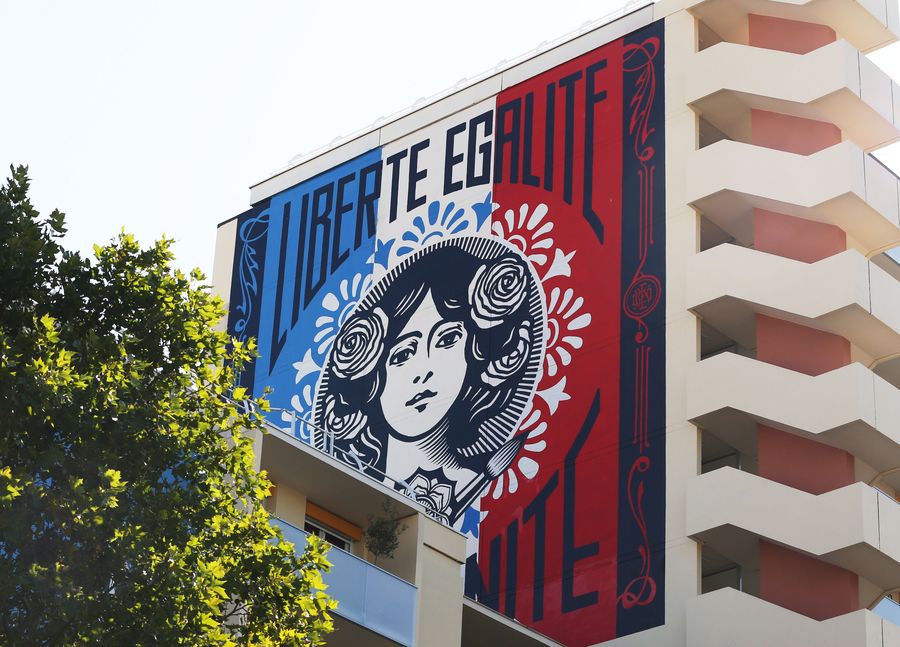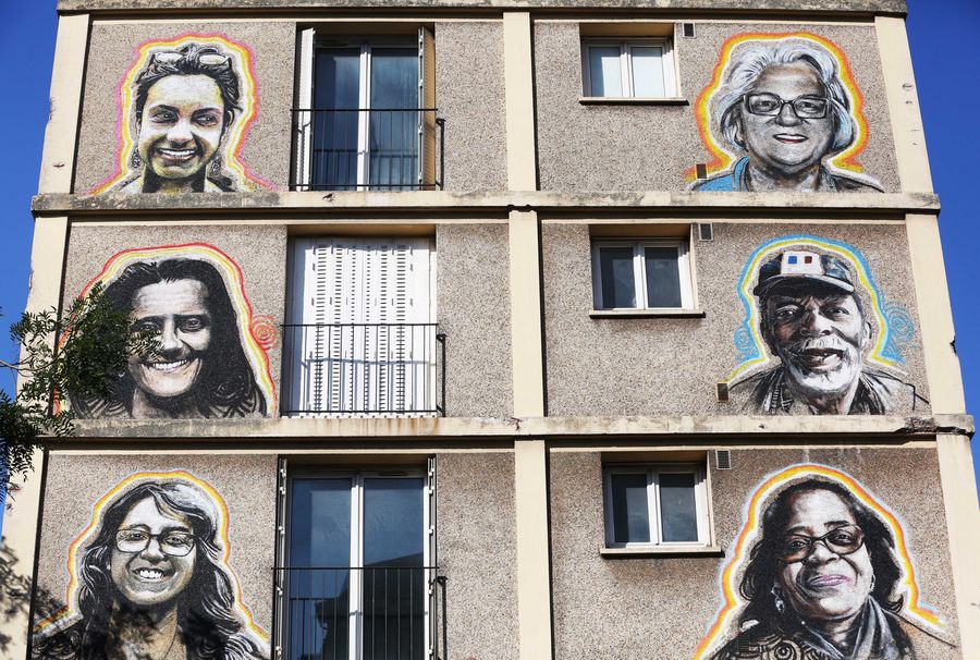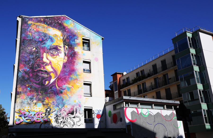 People pass by a building with mural paintings in Paris, France. (Xinhua/Gao Jing)