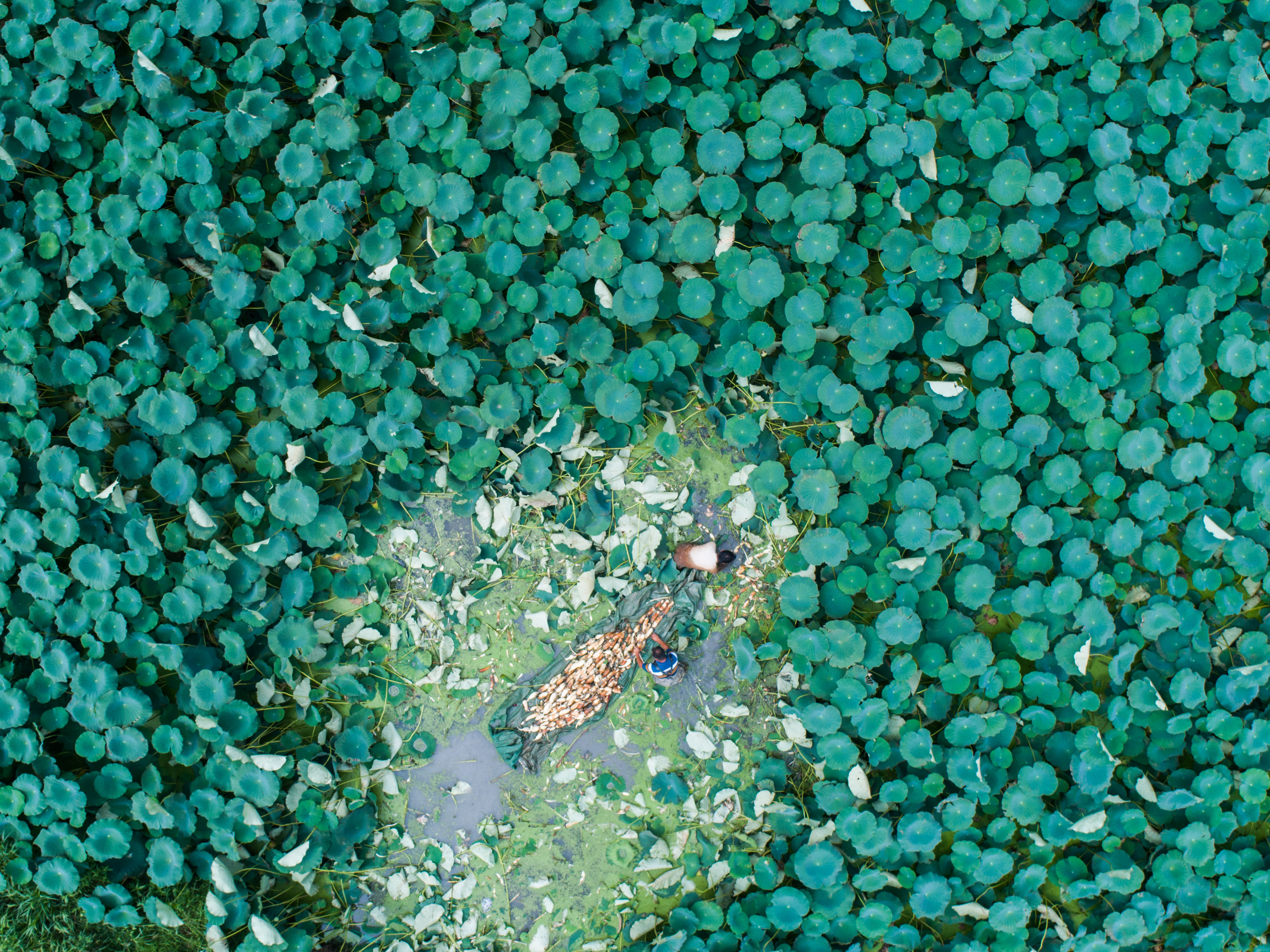 Aerial photo taken on Aug. 28, 2019 shows farmers harvest the lotus root in a pond at Donglin Township of Huzhou City, east China's Zhejiang Province. (Xinhua/Xu Yu)
