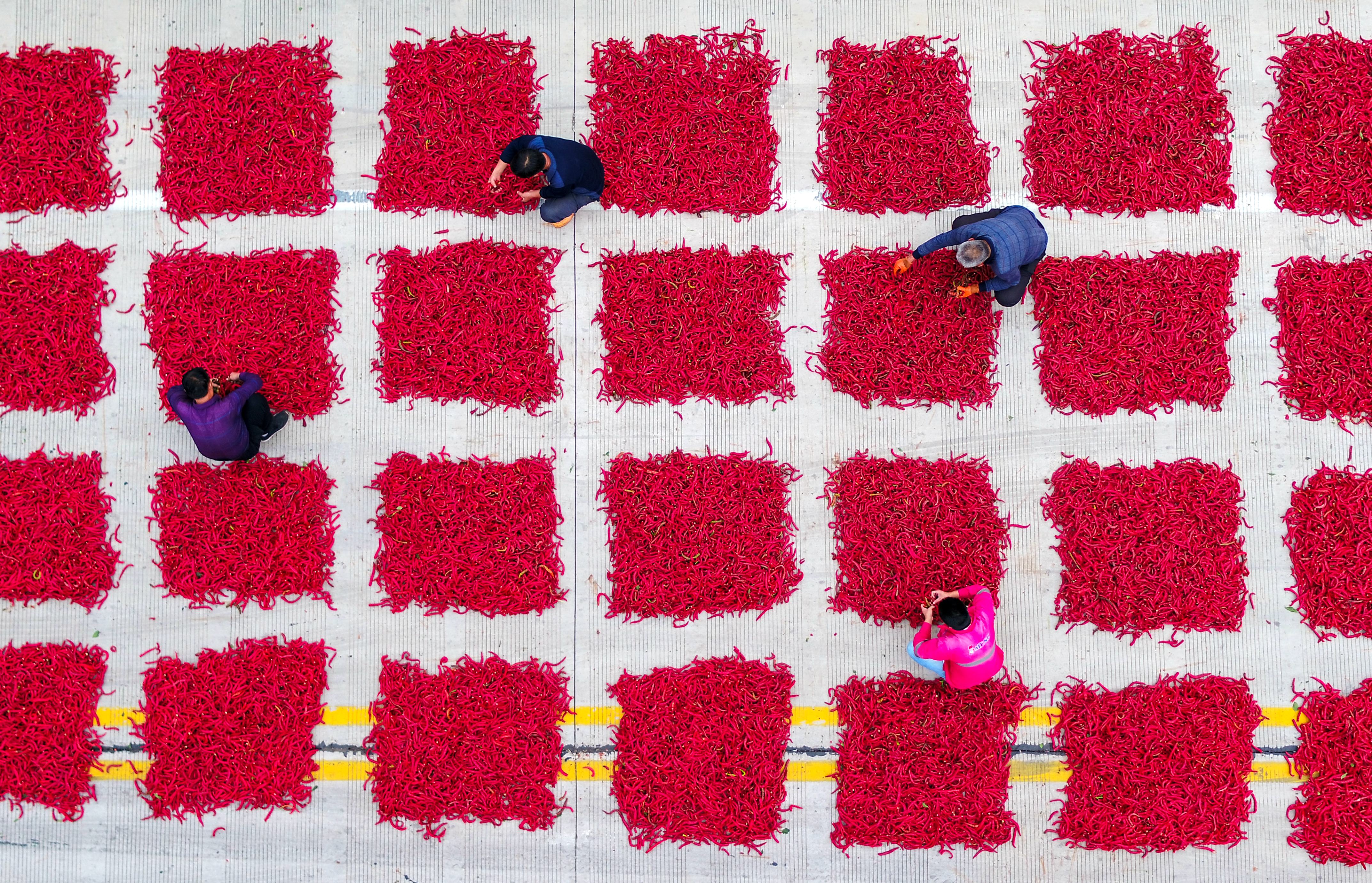 Aerial photo taken on Sept. 19, 2019 shows farmers airing chilies at a chili processing factory in Jize County of Handan, north China's Hebei Province. The Chinese farmers' harvest festival falls on the Autumn Equinox, or Sept. 23 this year. (Xinhua/Wang Xiao)