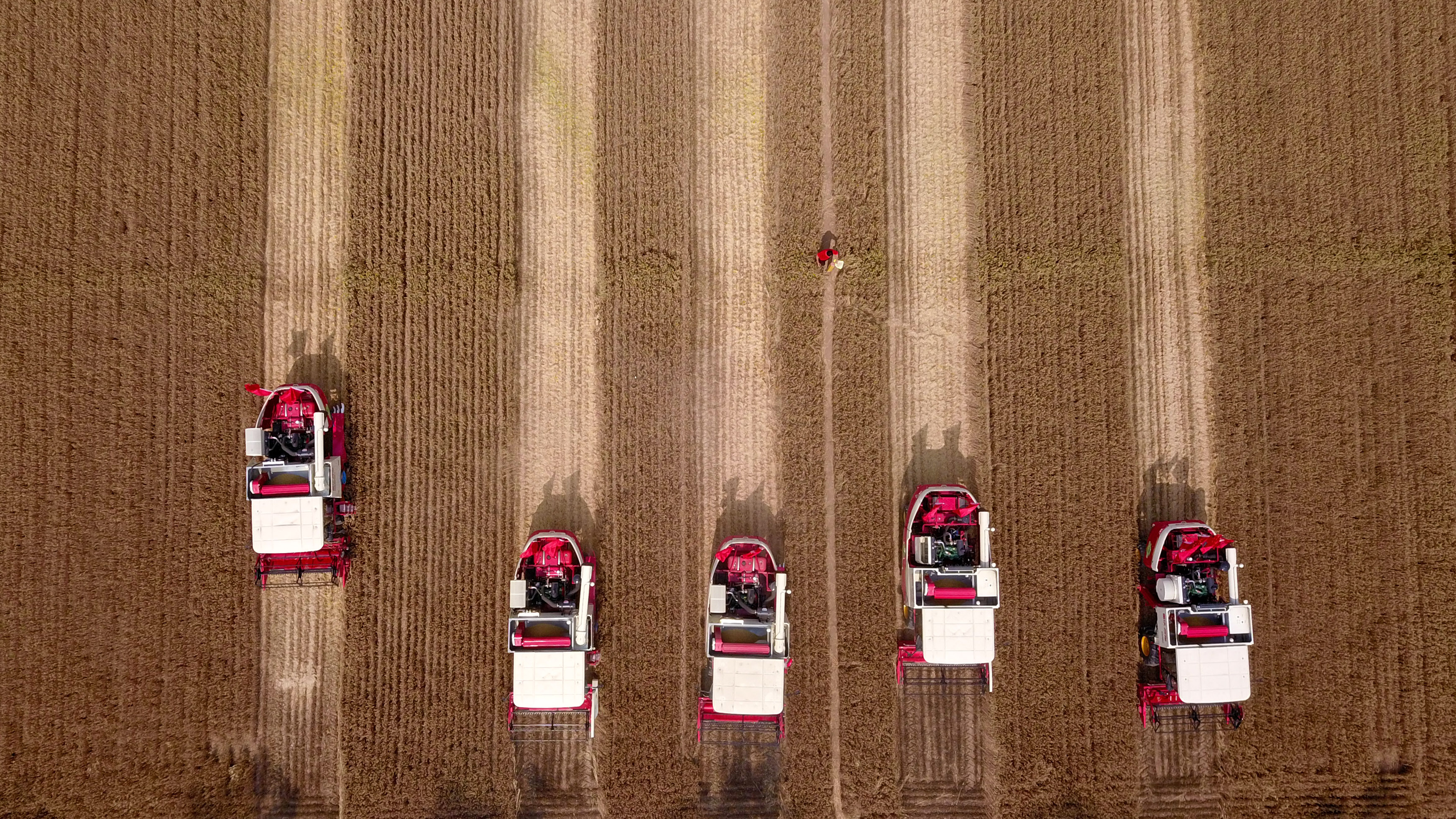 Aerial photo taken on May 31, 2019 shows reapers harvesting wheat at Zhongshan Township in Jiaxiang County in Jining City, east China's Shandong Province.(Xinhua/Guo Xulei)
