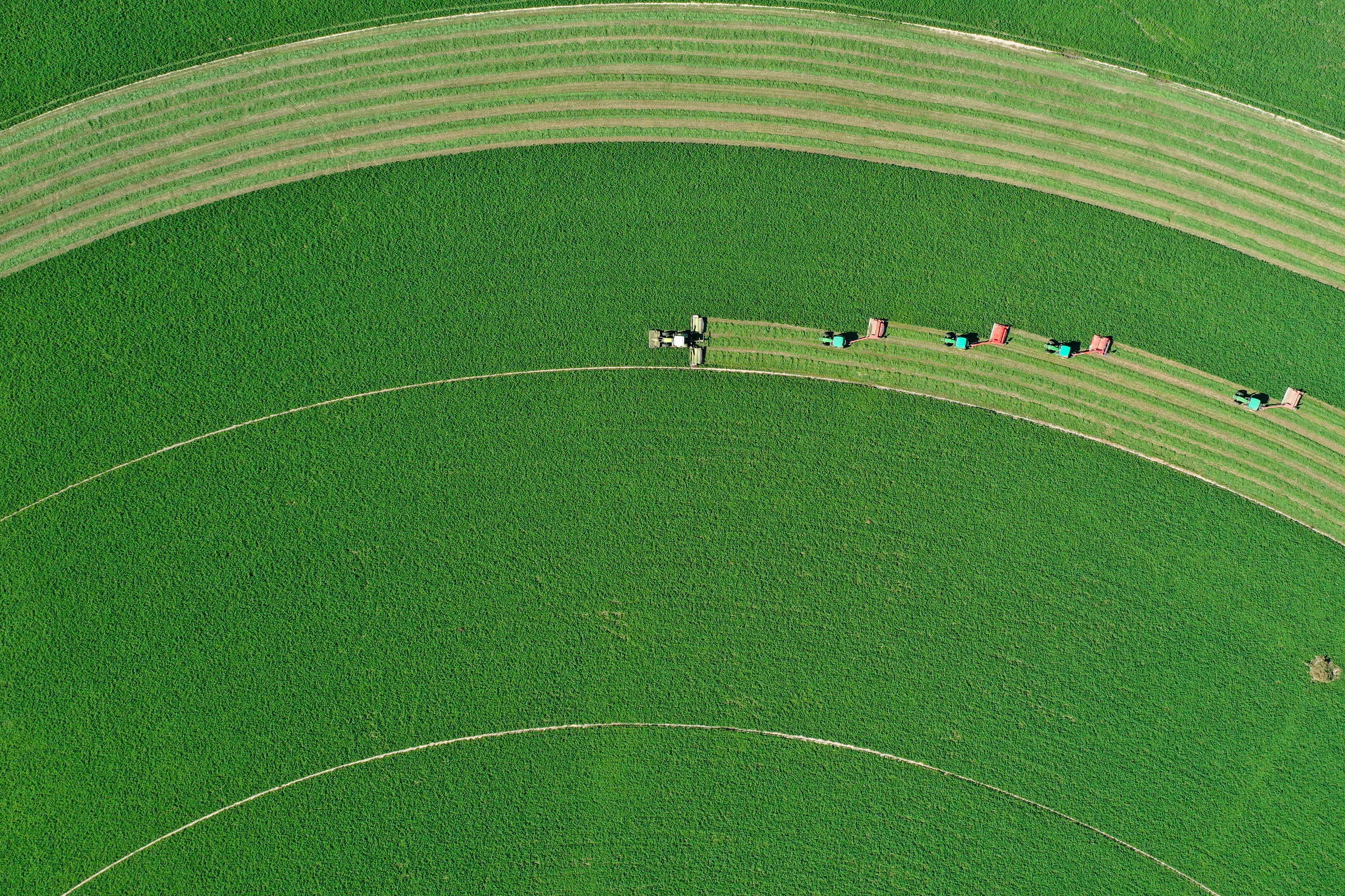Aerial photo taken on Sept. 20, 2019 shows harvesters cropping alfalfa in Ar Horqin Banner of north China's Inner Mongolia Autonomous Region. (Xinhua/Liu Lei)