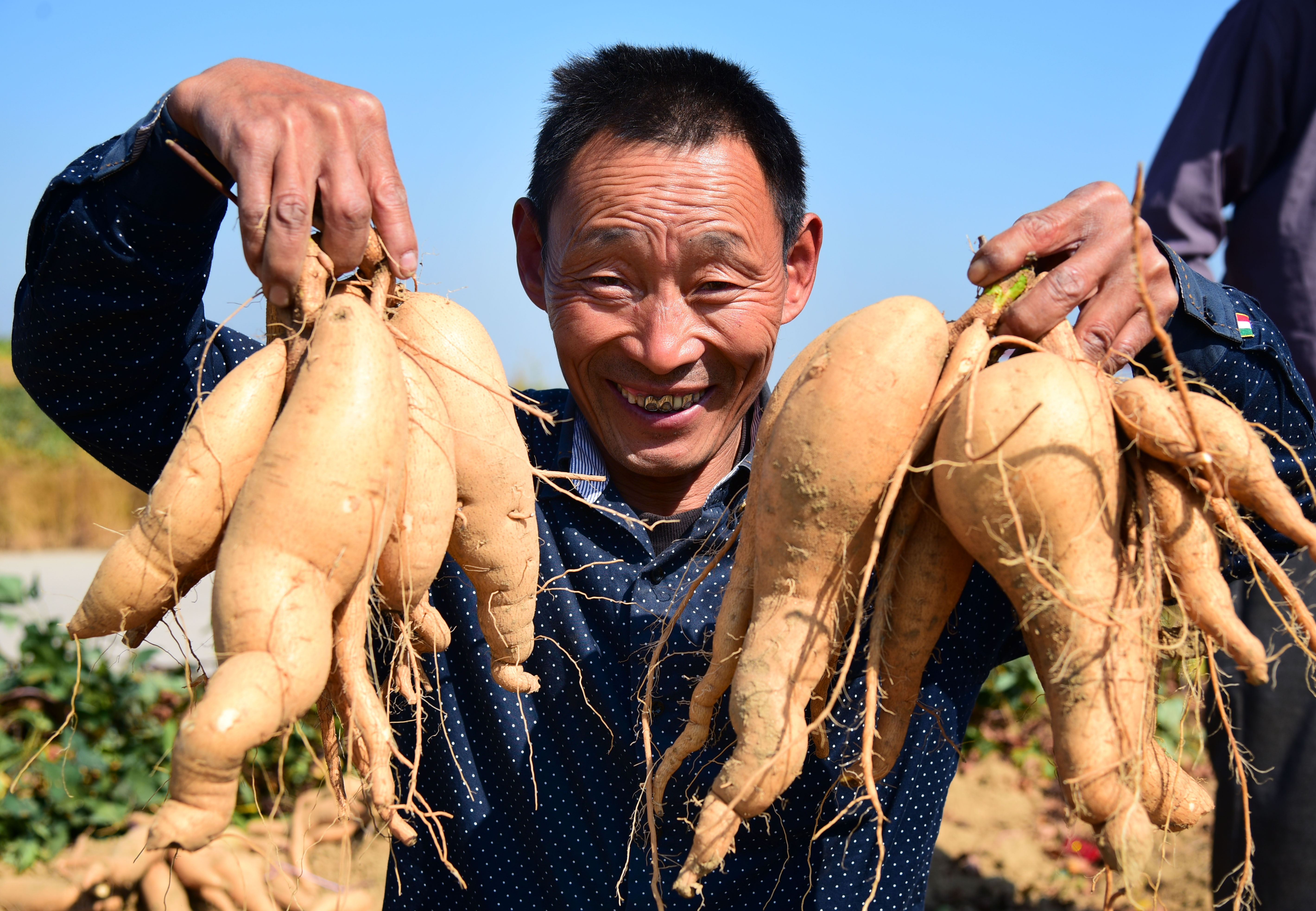 A farmer displays sweet potatoes at Liuquan Village of Dianzi Town in Zaozhuang City, east China's Shandong Province, Sept. 22, 2019.(Photo by Liu Mingxiang/Xinhua)