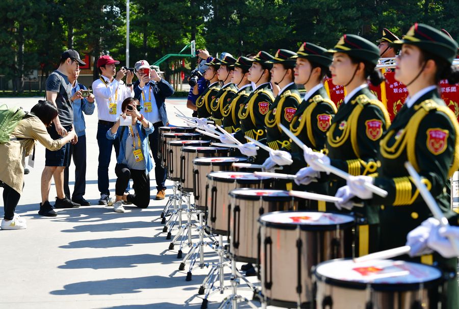 Journalists observe a training session of military band during a visit to the National Day military parade training site in Beijing. (Xinhua/Wei Peiquan)