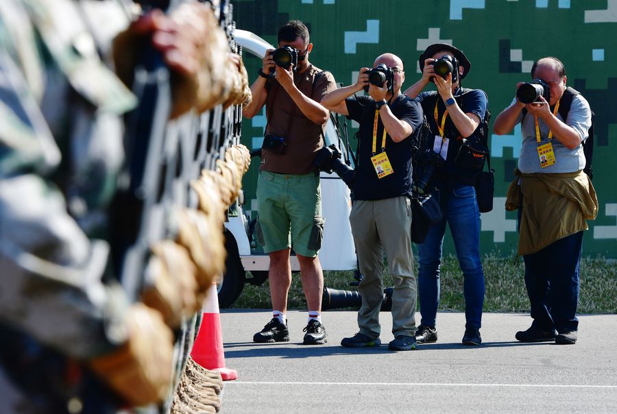 Journalists take photos during a visit to the National Day military parade training site in Beijing. (Xinhua/Wei Peiquan)