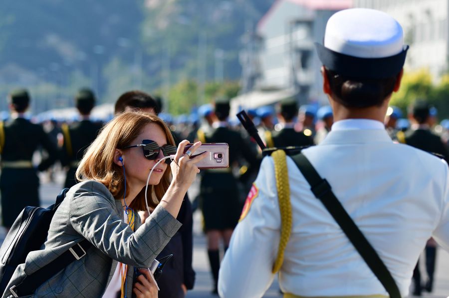 A journalist takes photos during a visit to the National Day military parade training site in Beijing. (Xinhua/Wei Peiquan)