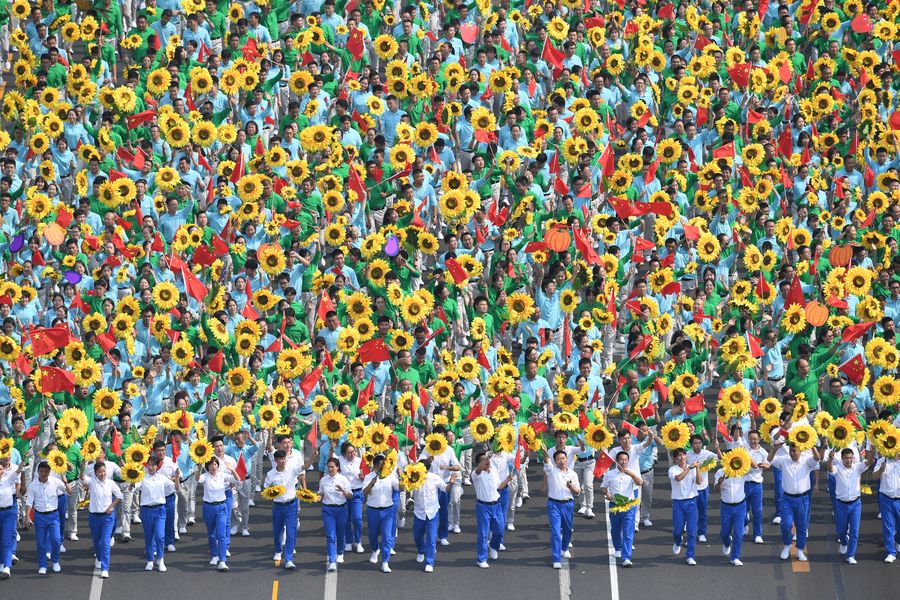 People take part in a mass pageantry celebrating the 70th anniversary of the founding of the People's Republic of China (PRC) in Beijing, capital of China, Oct. 1, 2019. (Xinhua/Ju Zhenhua)
