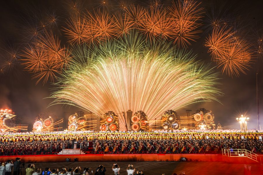 Fireworks explode during a grand evening gala marking the 70th founding anniversary of the People's Republic of China (PRC) in Beijing, capital of China, Oct. 1, 2019. (Xinhua/Jiang Wenyao)