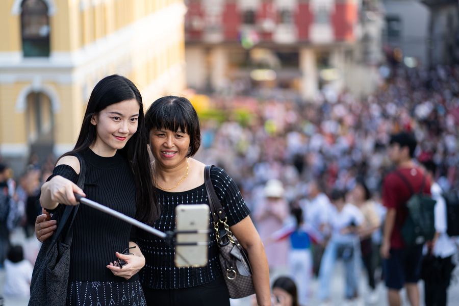 People take selfies in front of the Ruins of St. Paul's during the National Day holiday in Macao, south China, Oct. 2, 2019. (Xinhua/Cheong Kam Ka)