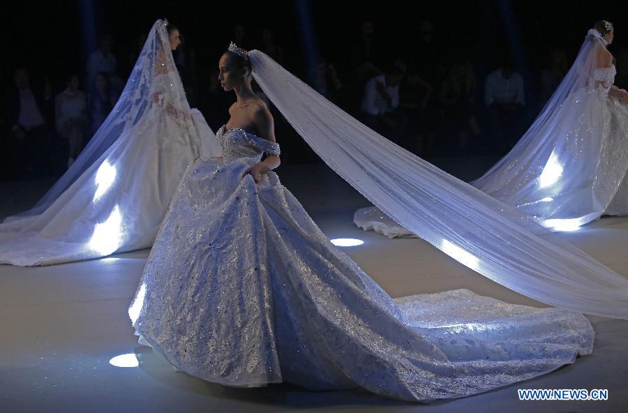 Models present creations by Kuwaiti designer Adiba Al Mahboub during the "Designers & Brands" fashion show in Beirut, Lebanon, on Oct. 8, 2019. (Photo by Bilal Jawich/Xinhua)