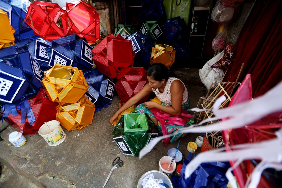 A worker arranges toy lanterns at a workshop in Yangon, Myanmar, Oct. 3, 2019. (Photo by U Aung/Xinhua)