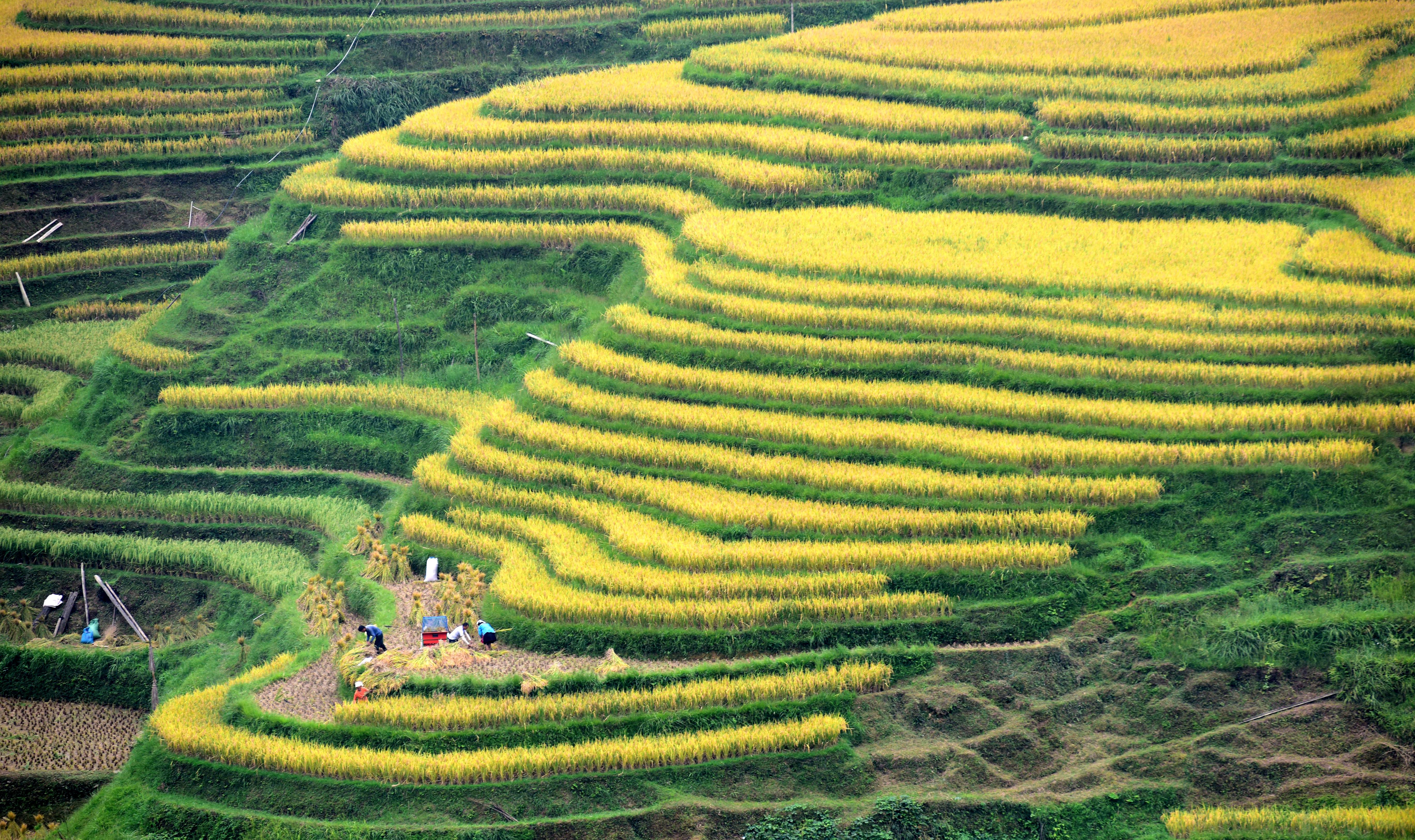 Farmers harvest rice on terraced fields at Dangyang Village of Bakai Township in Rongjiang County, southwest China's Guizhou Province, Sept. 12, 2018. (Xinhua/Shi Qingwei)