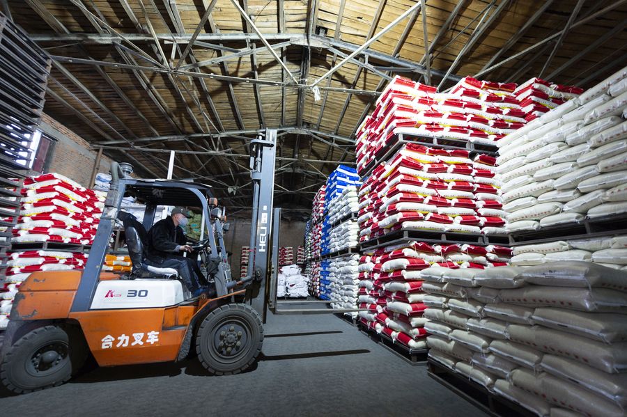 A worker loads the packaged rice at a rice processing company in northeast China's Heilongjiang Province, Oct. 12, 2019. (Xinhua/Xie Jianfei)