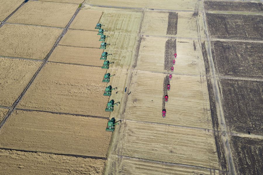 Combine harvesters are busy reaping crops in northeast China's Heilongjiang Province. Known as China's "grain barn," the province boasts the country's largest plantations of rice, corn and beans in vast tracts of fertile farmland.