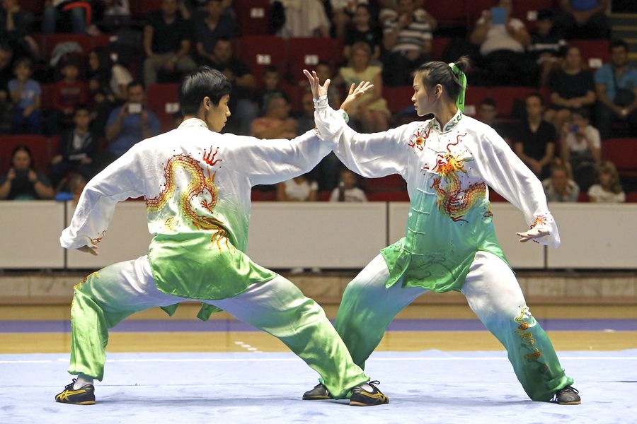 Members of Chinese Wushu Federation perform during an event organized in Bucharest, capital of Romania, Sept. 18, 2019. (Photo by Cristian Cristel/Xinhua)