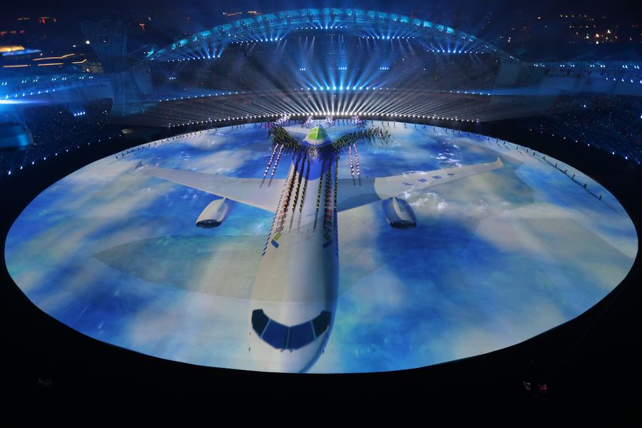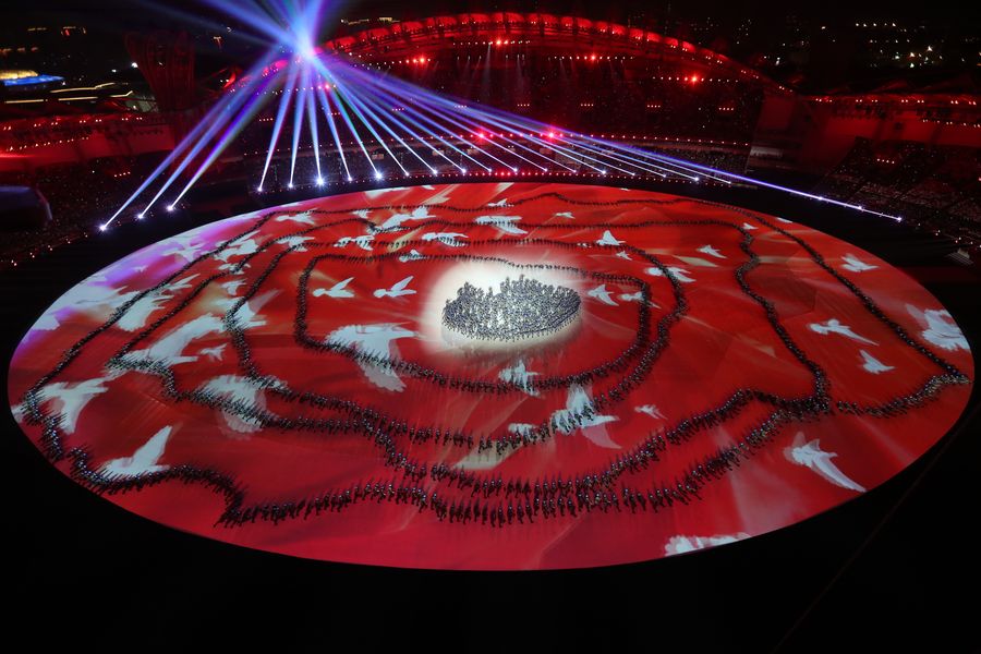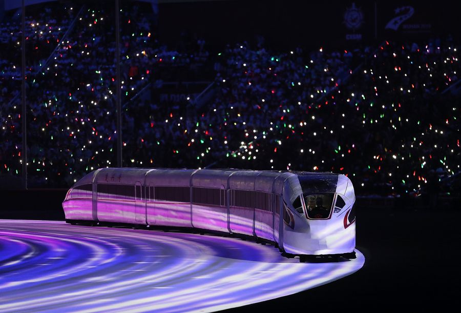 Photo taken on Oct. 18, 2019 shows the art performance during the opening ceremony of the 7th CISM Military World Games in Wuhan, capital of central China's Hubei Province. (Xinhua/Liu Xu)