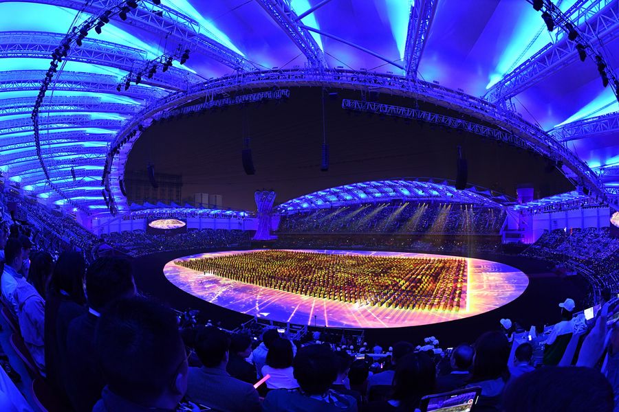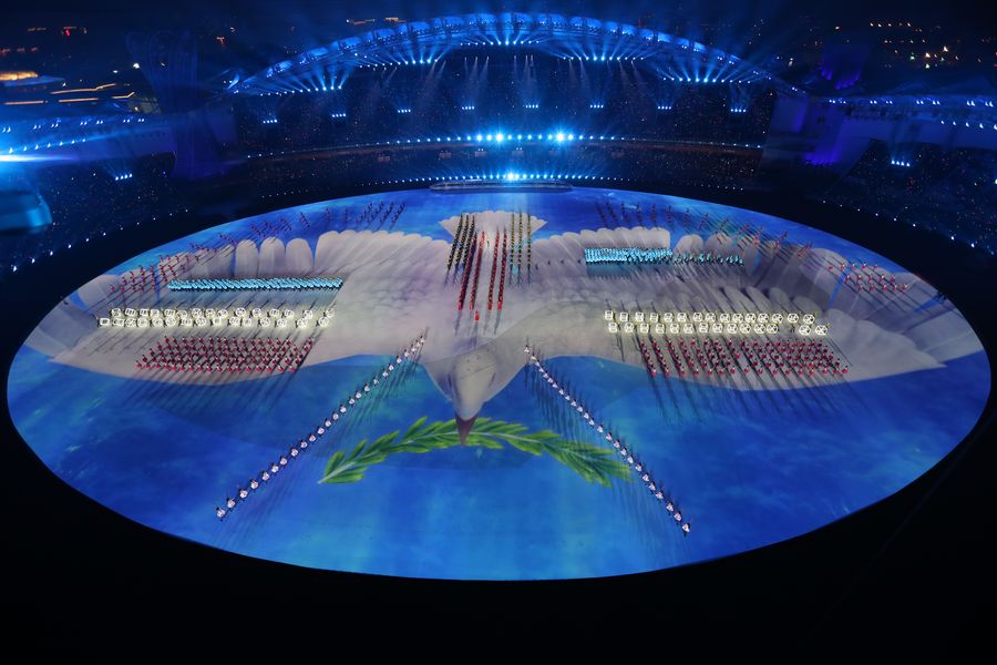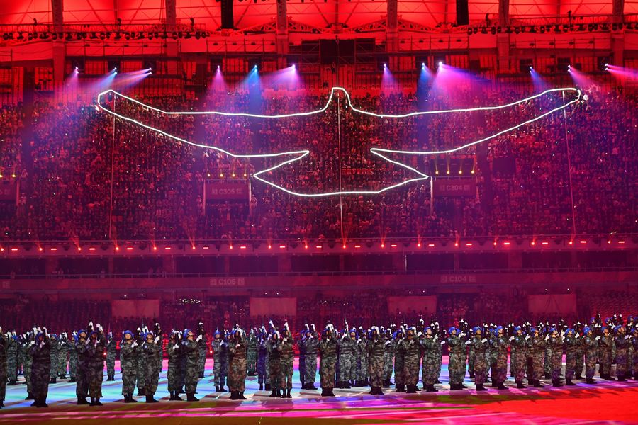 Photo taken on Oct. 18, 2019 shows the performance during the opening ceremony of the 7th CISM Military World Games in Wuhan, capital of central China's Hubei Province. (Xinhua/Li Gang)