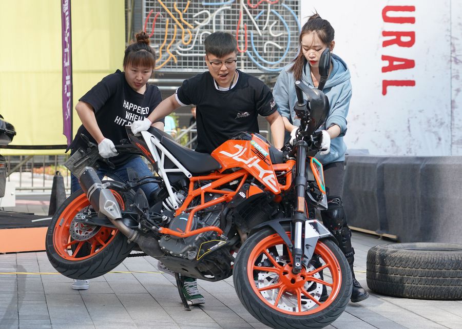 Participants move a motorcycle during a contest of the 2nd Glorious Plaza Motorcycle Cultural Festival in Xi'an, capital city of northwest China's Shaanxi Province, Sept. 22, 2019. (Xinhua/Shao Rui)