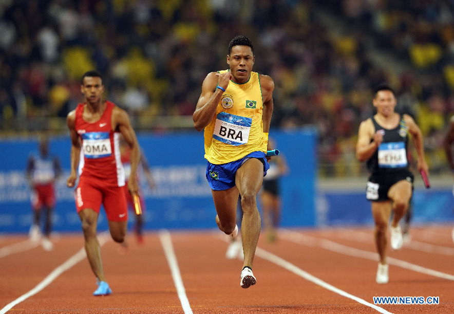 Paulo Andre Oliveira (C) of Brazil competes during Men's 4 x 100m Relay Final of track and field at the 7th CISM Military World Games in Wuhan, capital of central China's Hubei Province, Oct. 24, 2019. (Xinhua/Jin Liangkuai)