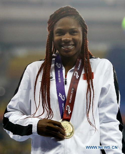 Aminat Jamal of Bahrain celebrates during the awarding ceremony of the women's 400m hurdles final of track and field at the 7th CISM Military World Games in Wuhan, capital of central China's Hubei Province, Oct. 24, 2019. (Xinhua/Jin Liangkuai)