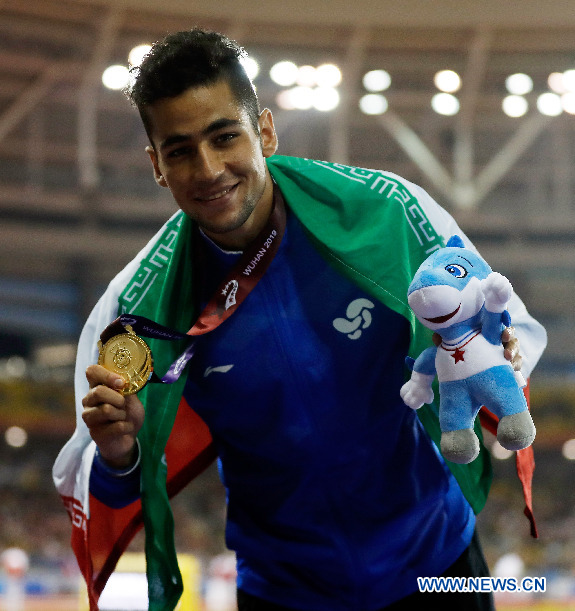 Gold medalist Mahdi Pirjahan of Iran celebrates after the awarding ceremony of men's 400m hurdles of track and field at the 7th CISM Military World Games in Wuhan, capital of central China's Hubei Province, Oct. 24, 2019. (Xinhua/Wang Lili)