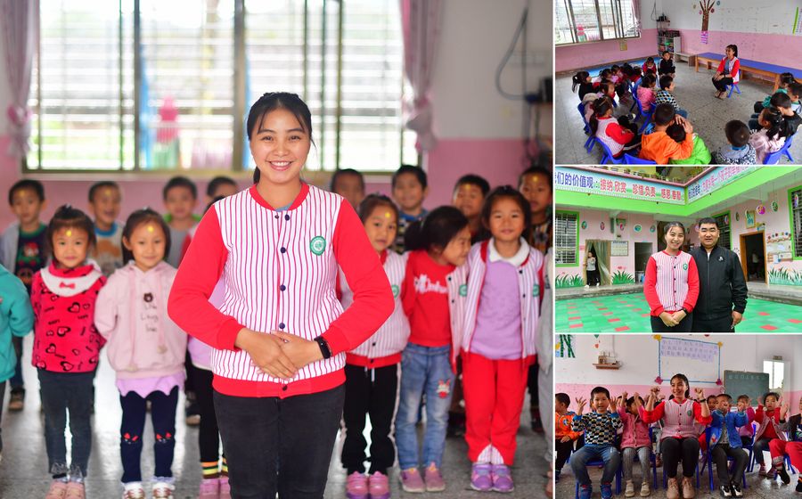 Combo photo shows 21-year-old kindergarten teacher Yang Meiliu posing for a picture (main image in the layout); and Yang's work and life (smaller images in the right-side column), in Banlan Township, Rong'an County, south China's Guangxi Zhuang Autonomous Region, Oct. 23, 2019. Yang's boyfriend, Yang Zhixian, has been working in Banlan Township for seven years. She joined him to work as a kindergarten teacher after graduation from college this year. (Xinhua/Huang Xiaobang)