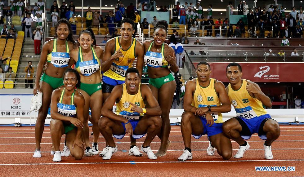 Team Brazil celebrate after 4x100m relay finals of track and field at the 7th CISM Military World Games in Wuhan, capital of central China's Hubei Province, Oct. 24, 2019. (Xinhua/Wang Lili)