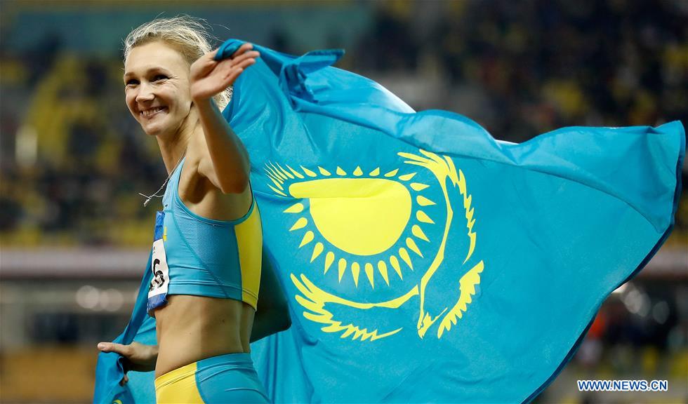 Olga Rypakova of Kazakhstan celebrates after the women's triple jump final of track and field at the 7th CISM Military World Games in Wuhan, capital of central China's Hubei Province, Oct. 25, 2019. (Xinhua/Wang Lili)