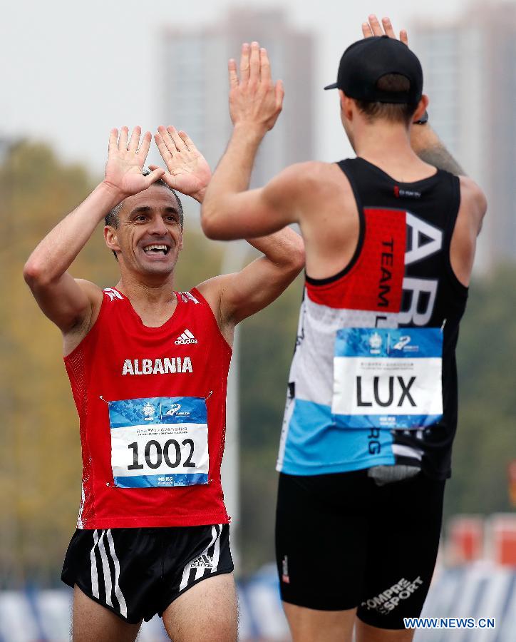 Renato Dorzi (L) of Albania celebrates after the men's marathon individual final of track and field at the 7th CISM Military World Games in Wuhan, capital of central China's Hubei Province, Oct. 27, 2019. (Xinhua/Wang Lili)