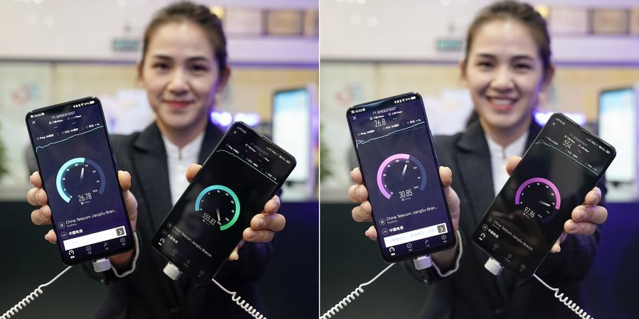 Combination photo taken in a branch of China Telecom in Beijing shows the comparison of uploading speed (L) and downloading speed between 4G service (the left device in each picture) and 5G service, Oct. 31, 2019. (Xinhua/Shen Bohan)